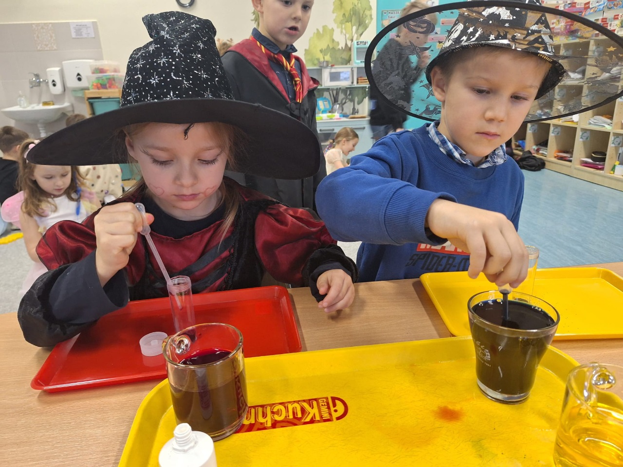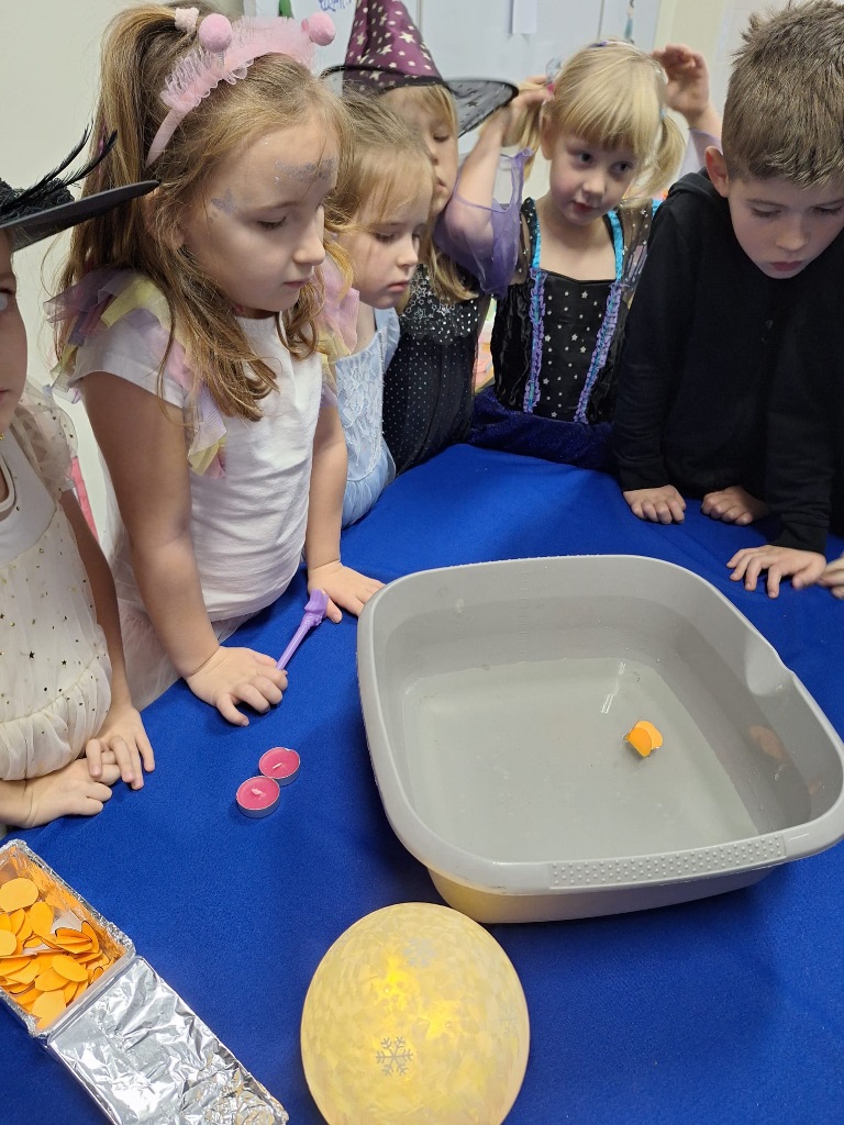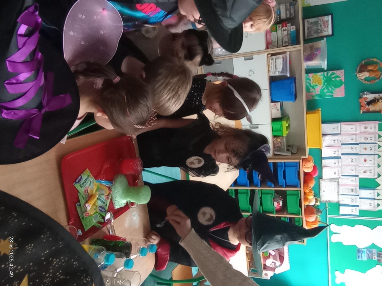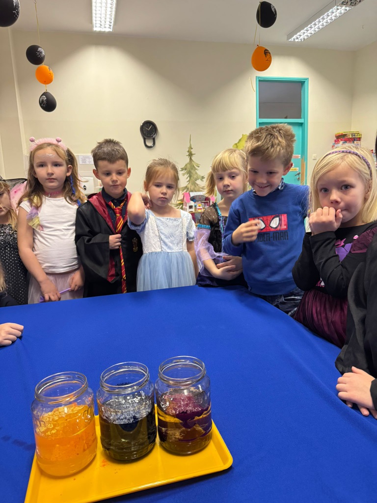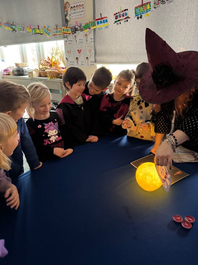 Podczas wspólnych zabaw nie zabrakło tradycyjnych wróżb andrzejkowych. Dzieci losowały przedmioty symbolizujące przyszłe zawody, sprawdzały, co je czeka, układały buciki do drzwi. Każda wróżba zyskiwała dodatkowy urok dzięki czarodziejskiej tematyce – różdżki i zaklęcia towarzyszyły niemal wszystkim aktywnościom.