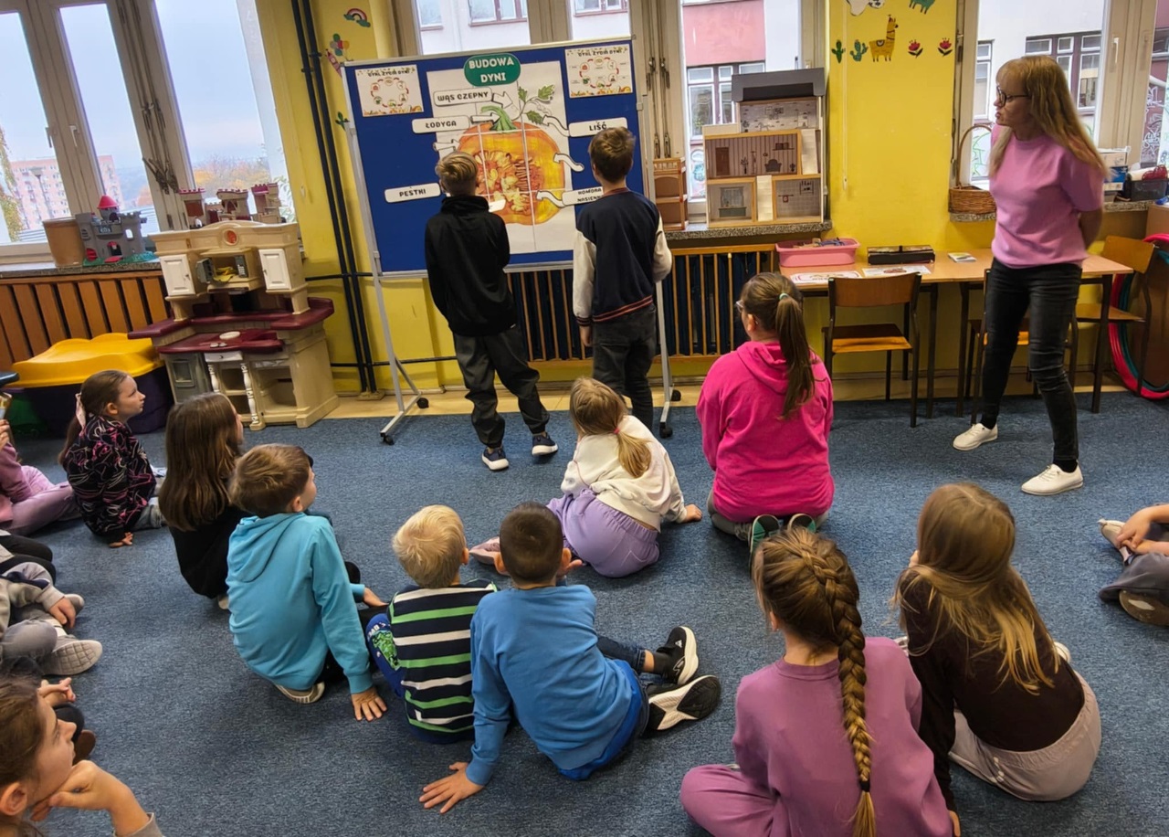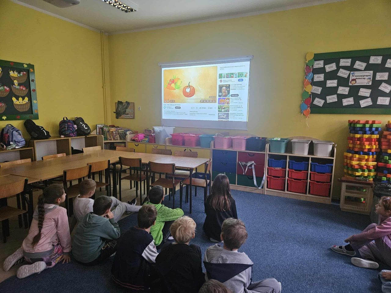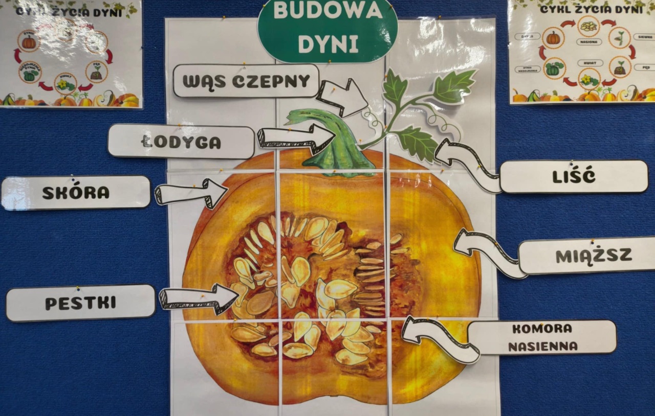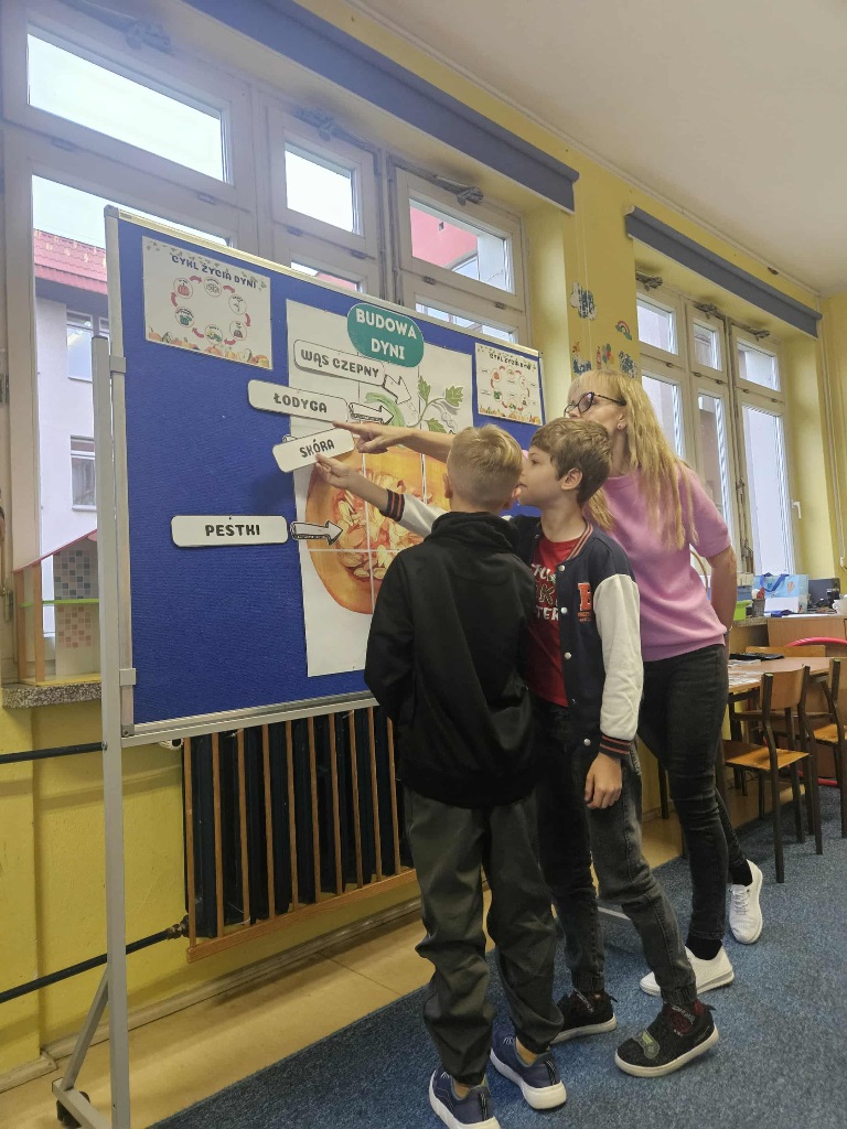 Na początku obejrzeliśmy film edukacyjny, dzięki któremu dowiedzieliśmy się, skąd pochodzi dynia, jak jest zbudowana, jakie ma odmiany i jakie wartości odżywcze zawiera. Następnie, korzystając ze zdobytej wiedzy, dzieci we właściwe miejsca na tablicy umieszczały nazwy poszczególnych elementów dyni.