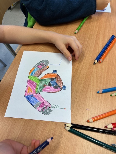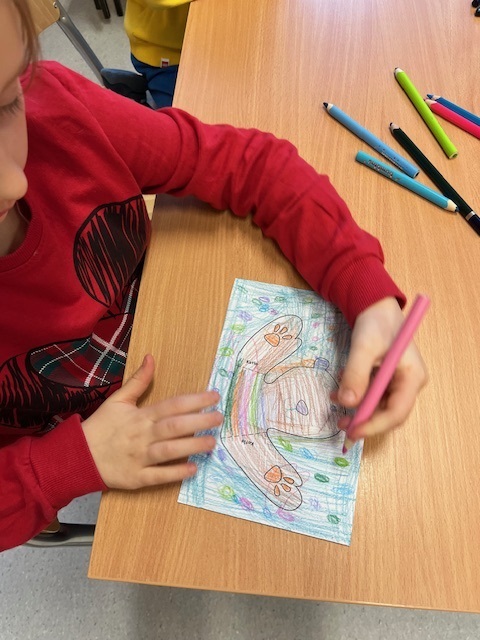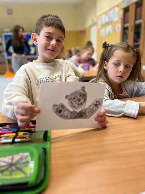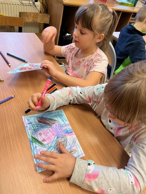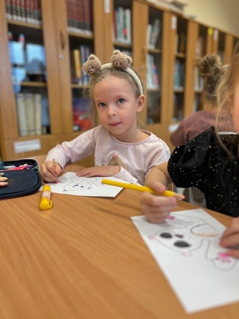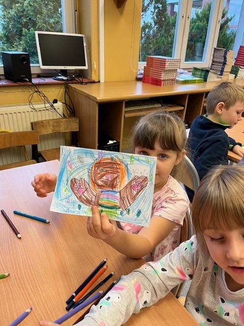 Natomiast uczniowie klasy pierwszej i drugiej w ramach lekcji bibliotecznej mieli okazje stać się przez chwilę ilustratorami projektując własną ilustracji do książki o przygodach misia.