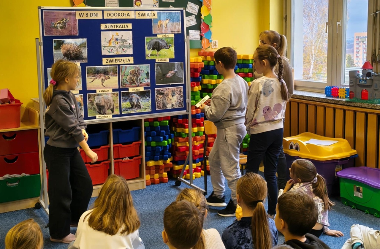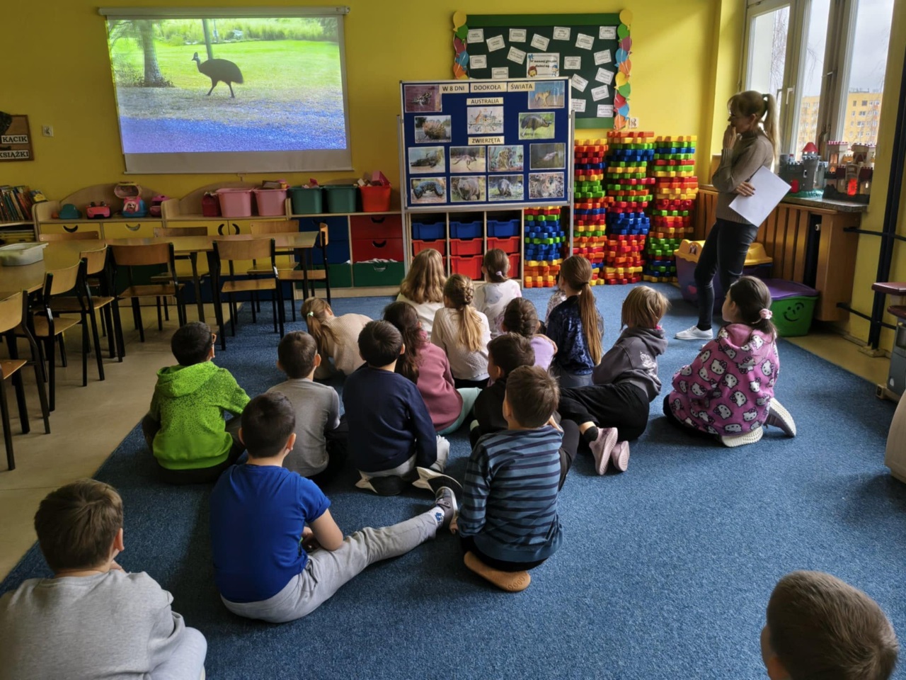 Na początku wspólnie obejrzeliśmy krótki film edukacyjny, który wprowadził nas w niezwykły świat australijskiej fauny. Następnie uczniowie dopasowywali nazwy zwierząt do ich zdjęć. Szczególną uwagę poświęciliśmy misiom koala, poznając wiele ciekawostek dotyczących ich życia, zwyczajów i środowiska naturalnego.