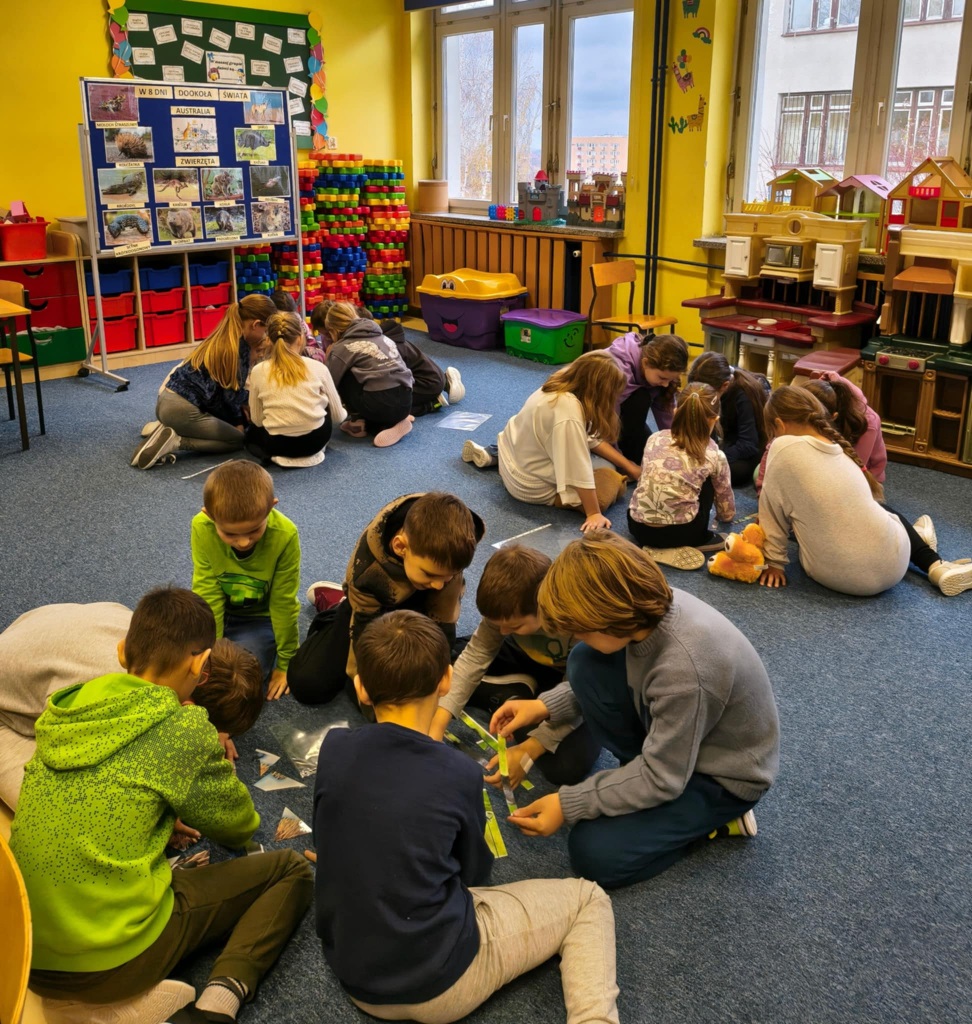Podsumowaniem zajęć była praca w zespołach - ułożenie puzzli przedstawiających zwierzęta. Była to świetna forma nauki, ale również okazja do rozwijania umiejętności współpracy i komunikacji.