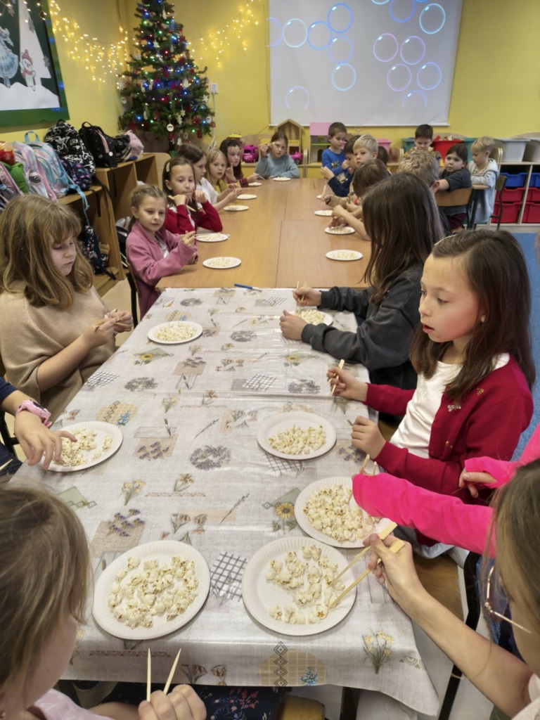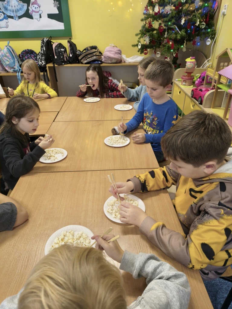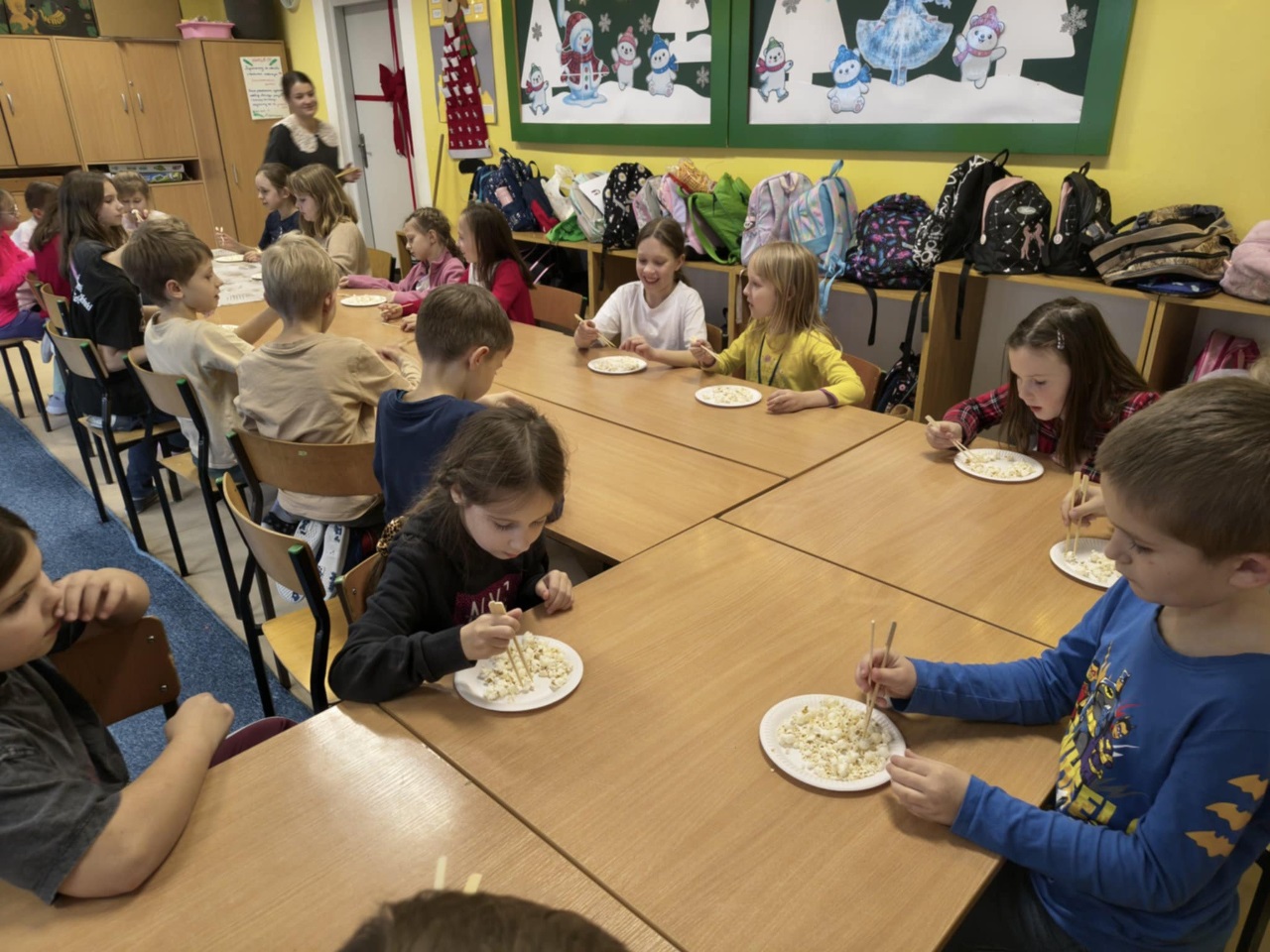 Ostatnim zadaniem była nauka jedzenia pałeczkami. Uczniowie na chwilę zamienili się w prawdziwych Azjatów i, starając się odpowiednio trzymać pałeczki, próbowali zjeść popcorn. To zadanie wywołało dużo śmiechu i było bardzo smakowite.