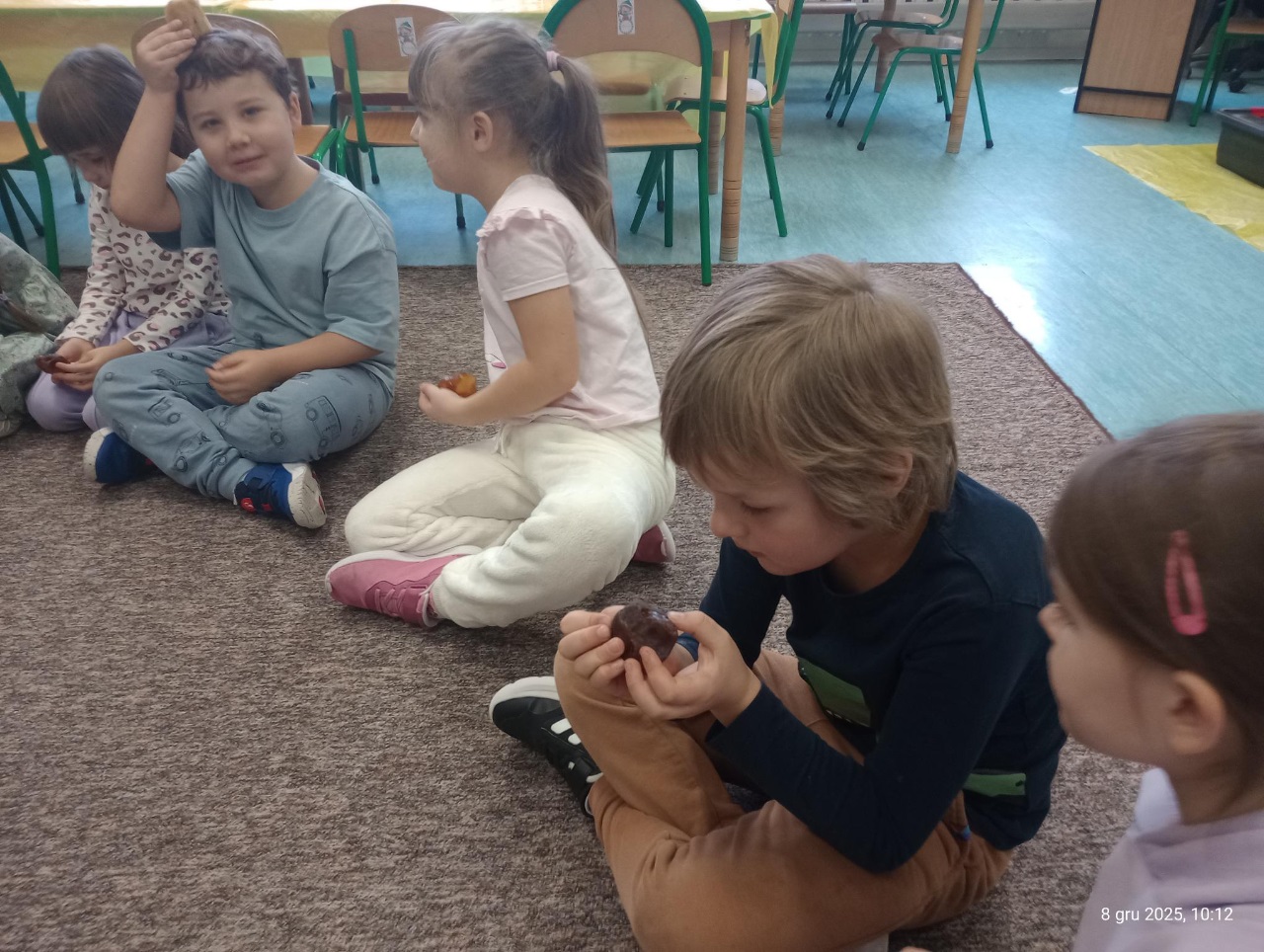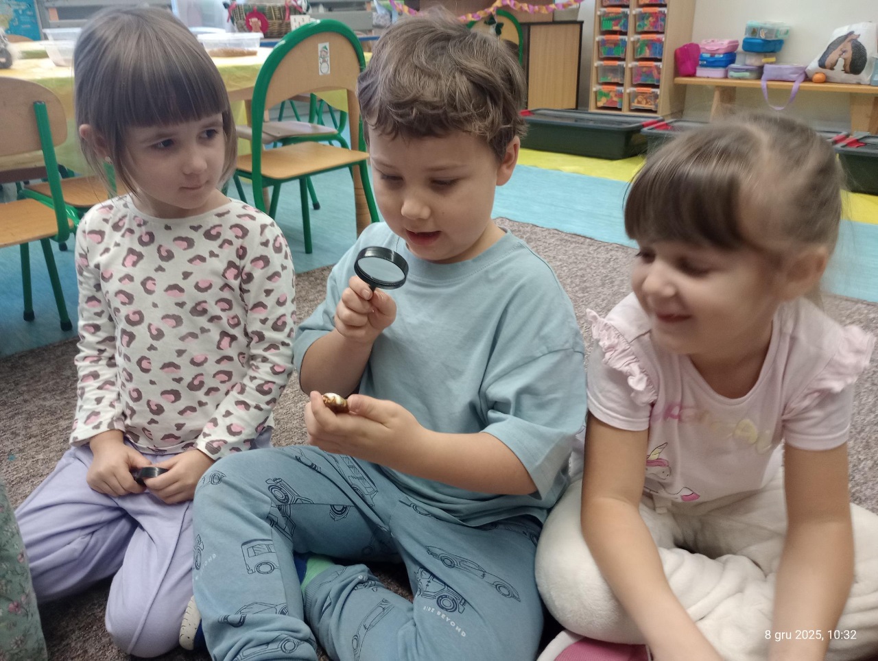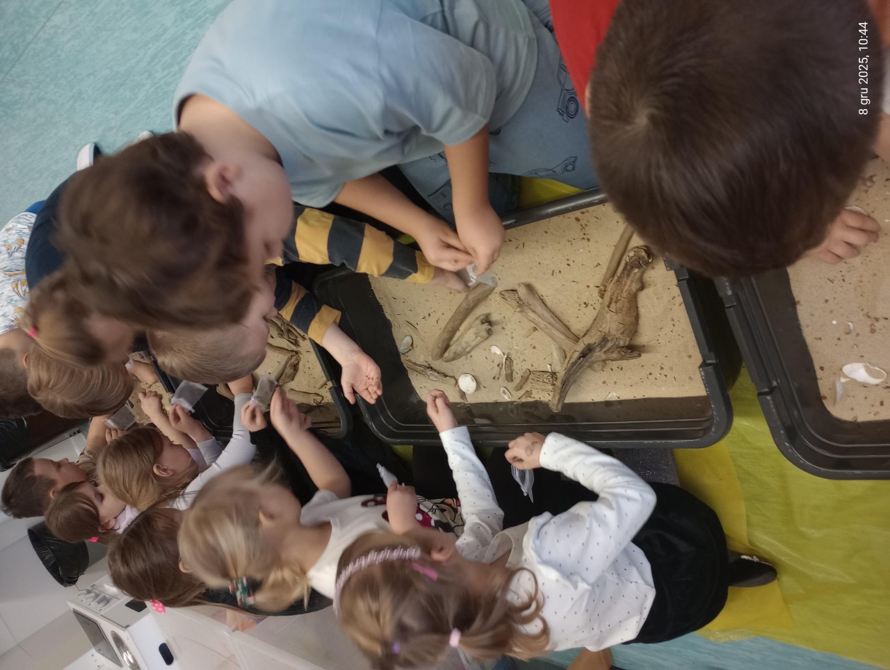 Warsztaty prowadzone przez Jantarkowo to ogromna dawka wiedzy, sensoryki i zabawy. Podczas warsztatów bursztynniczych Dzieci z grupy 0A wysłuchały opowieści, jak powstaje bursztyn, obejrzały inkluzje z owadami sprzed 40 mln lat. Grupa miała również okazję do samodzielnego poszukiwania bursztynu na zaimprowizowanej plaży z muszelkami, patykami i oczywiście bursztynami zakopanymi do odszukania.