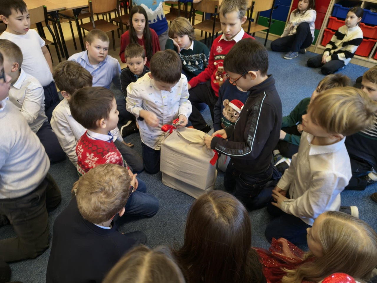 Największą radość wzbudziło jednak ostatnie zadanie z kalendarza – otwarcie worka z prezentami, który św. Mikołaj zostawił pod choinką w naszej świetlicy 😊. W środku czekały lalki, a także gry, z których dzieci będą mogły korzystać na co dzień podczas pobytu w świetlicy.