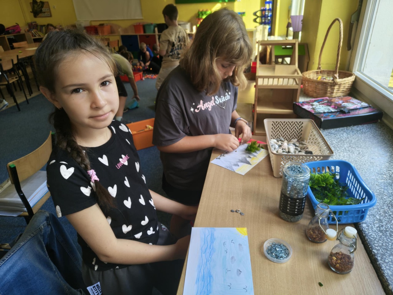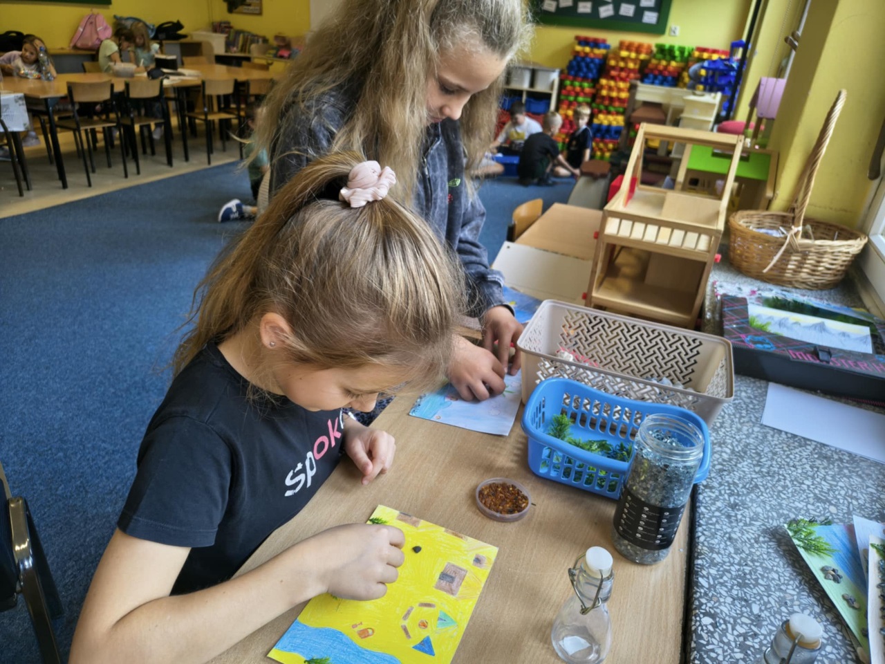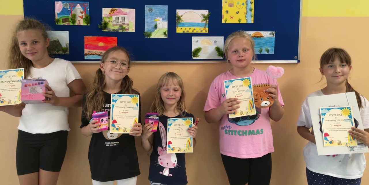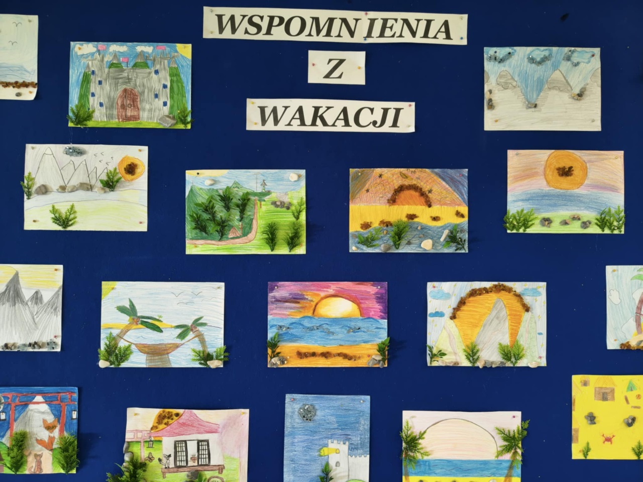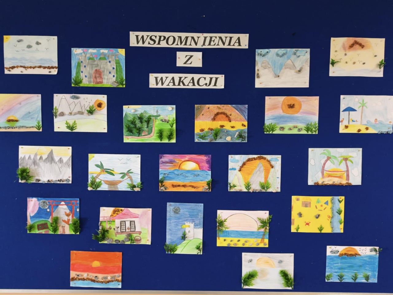 Po powrocie do szkoły uczniowie jeszcze długo dzielili się wspomnieniami z minionych wakacji. Aby na nowo przywołać obrazy miejsc, w których odpoczywali latem, w świetlicy klas trzecich został zorganizowany konkurs pt. „Pocztówka z wakacji”. Aby ozdobić swoje prace, uczestnicy sięgnęli po różne materiały przywiezione z wakacji, takie jak kamyki, bursztyny i inne.