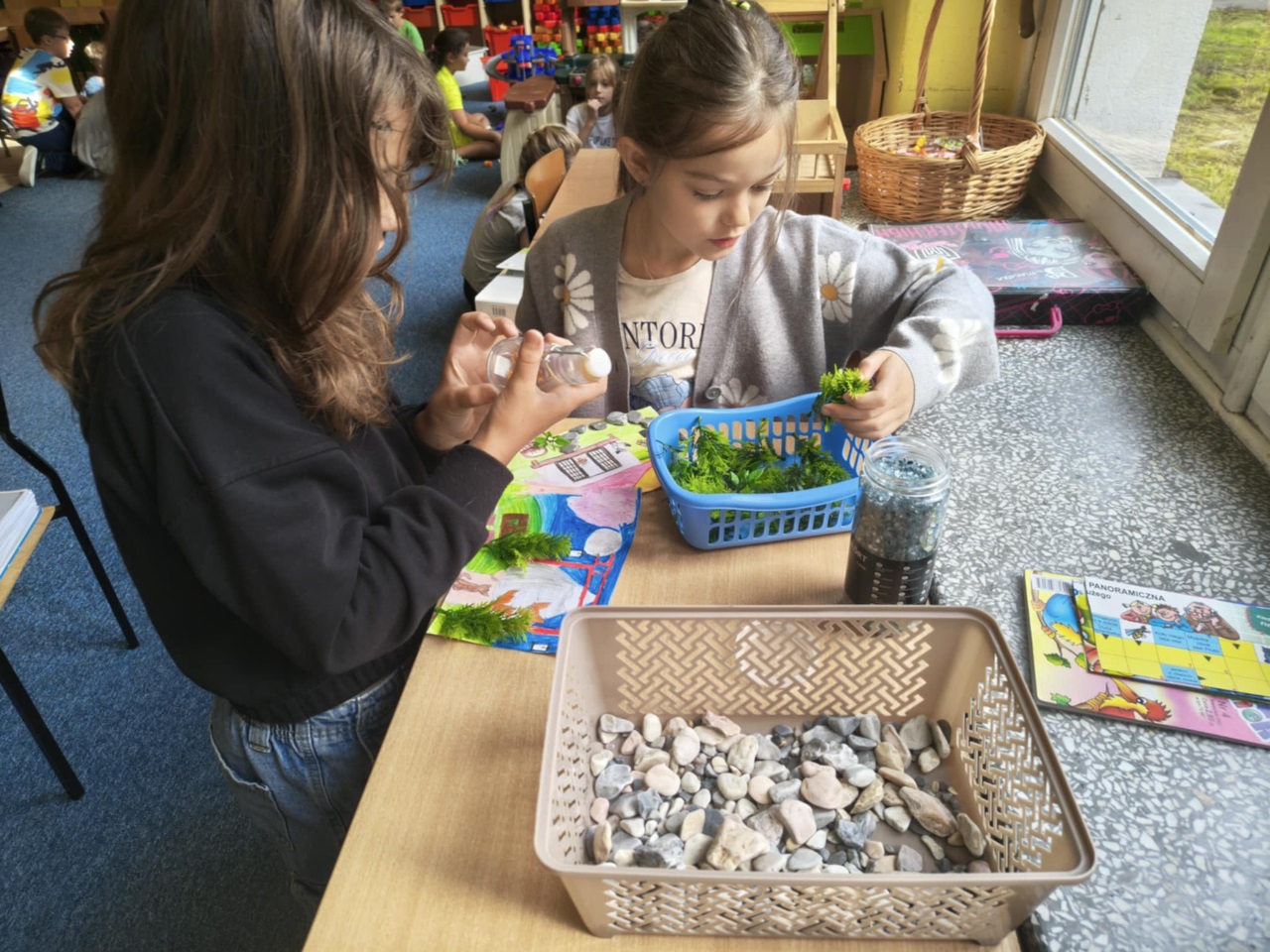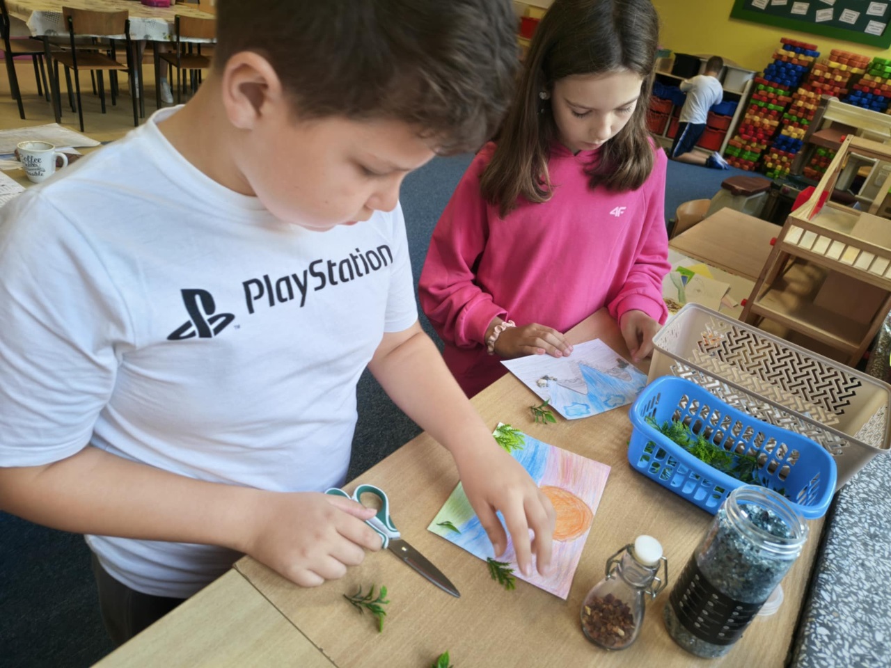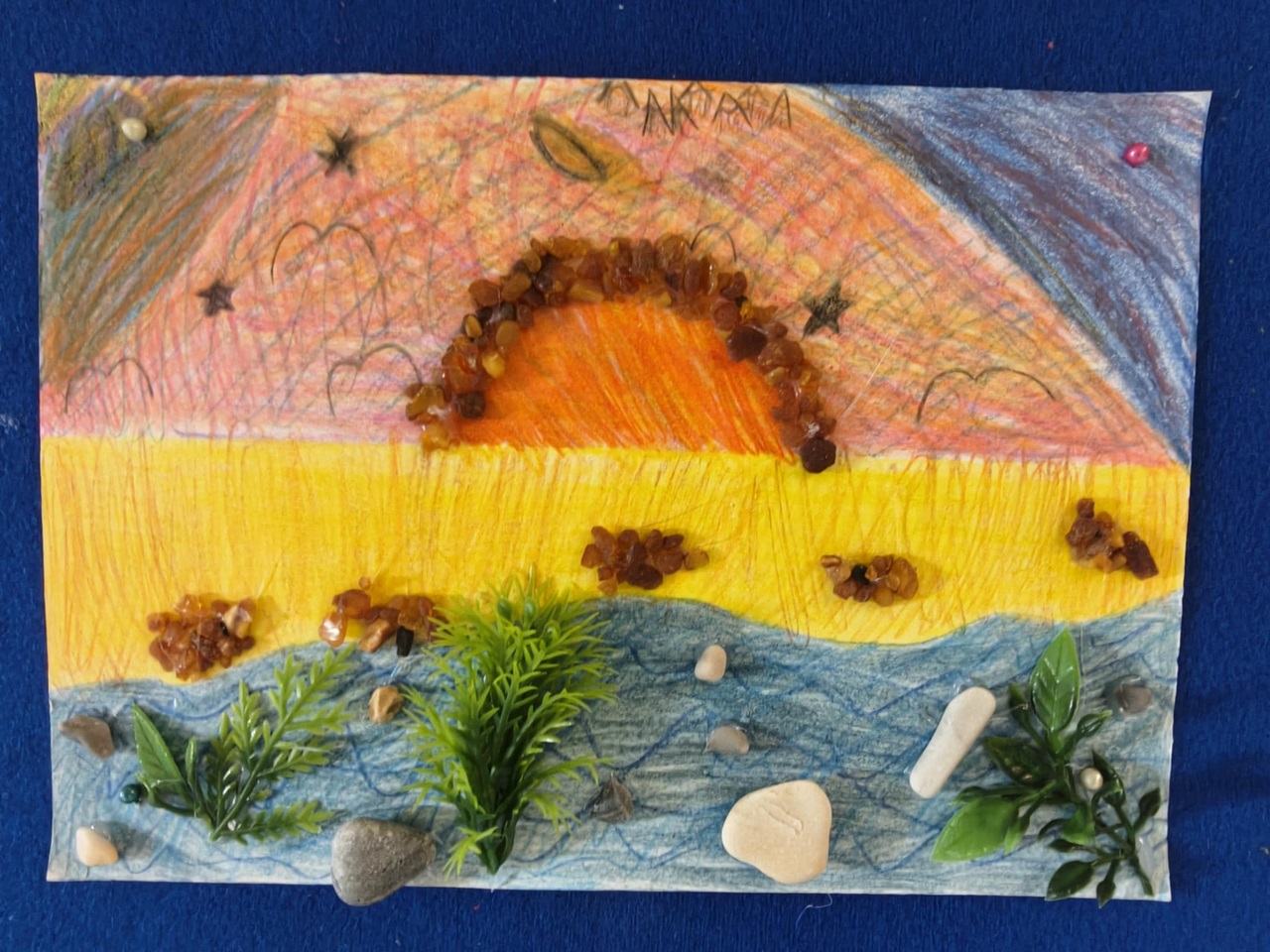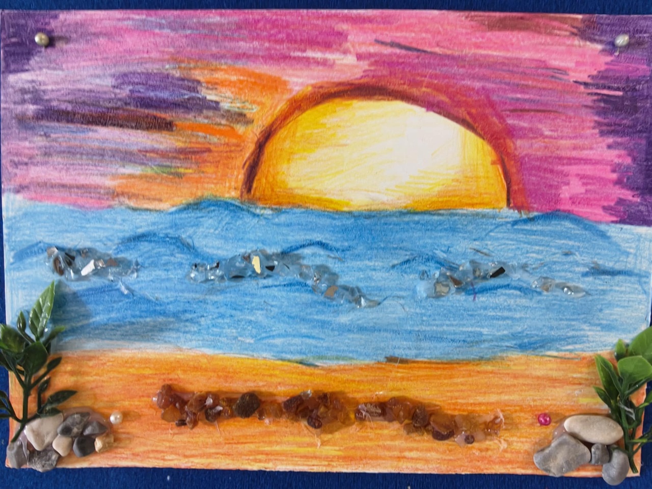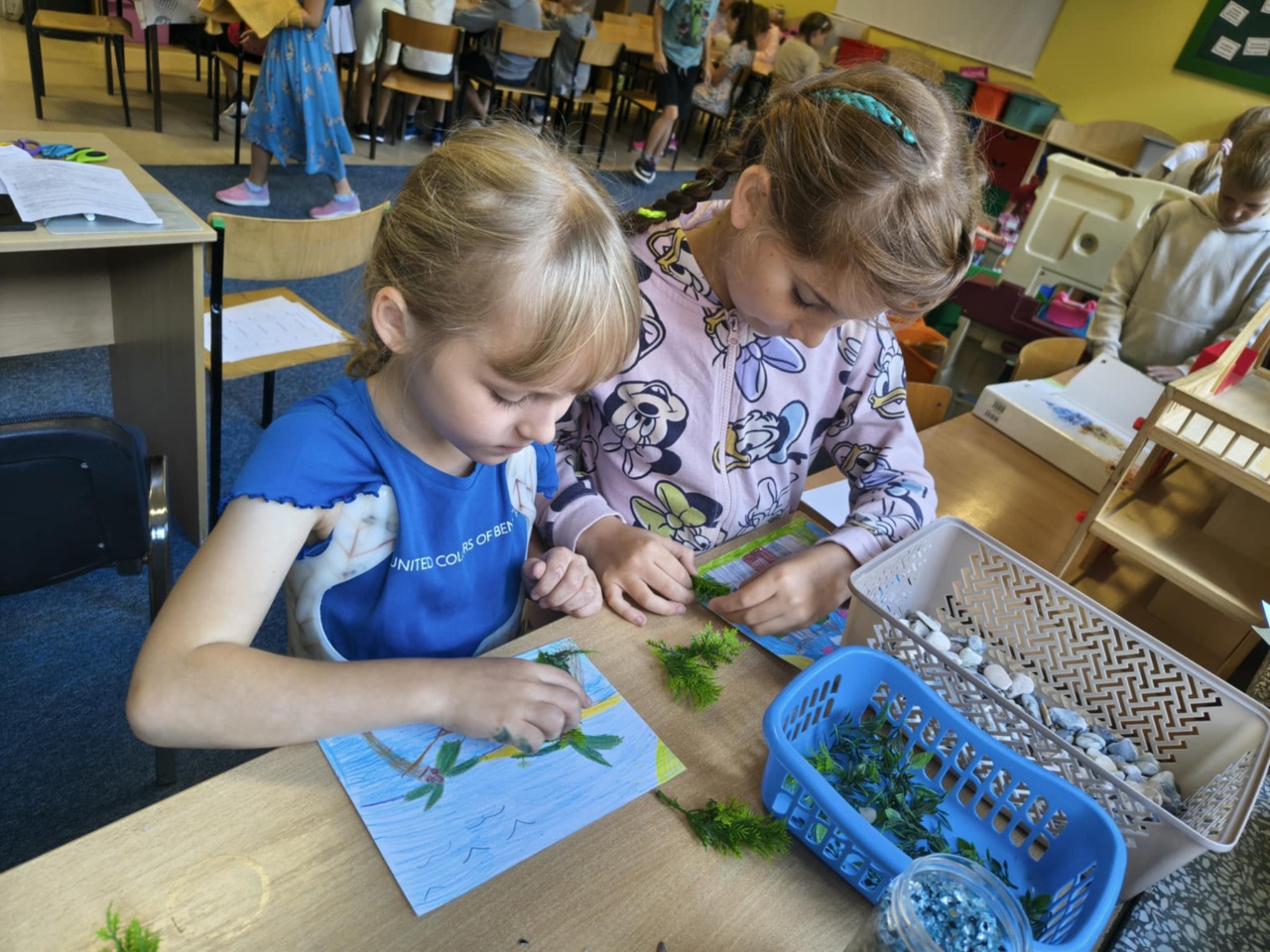 Po powrocie do szkoły uczniowie jeszcze długo dzielili się wspomnieniami z minionych wakacji. Aby na nowo przywołać obrazy miejsc, w których odpoczywali latem, w świetlicy klas trzecich został zorganizowany konkurs pt. „Pocztówka z wakacji”. Aby ozdobić swoje prace, uczestnicy sięgnęli po różne materiały przywiezione z wakacji, takie jak kamyki, bursztyny i inne.