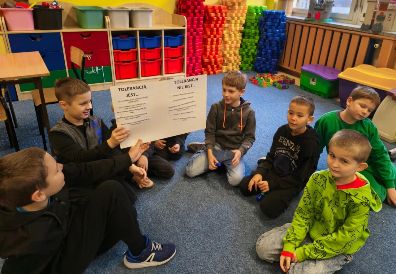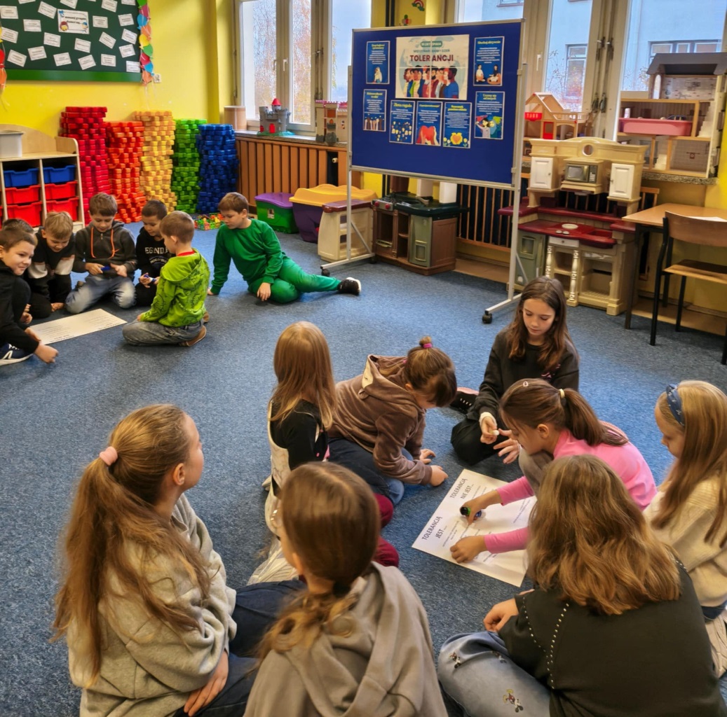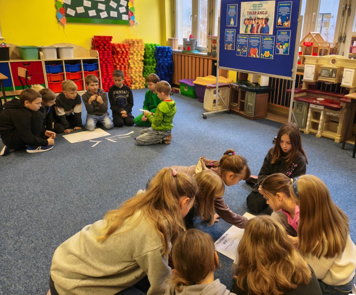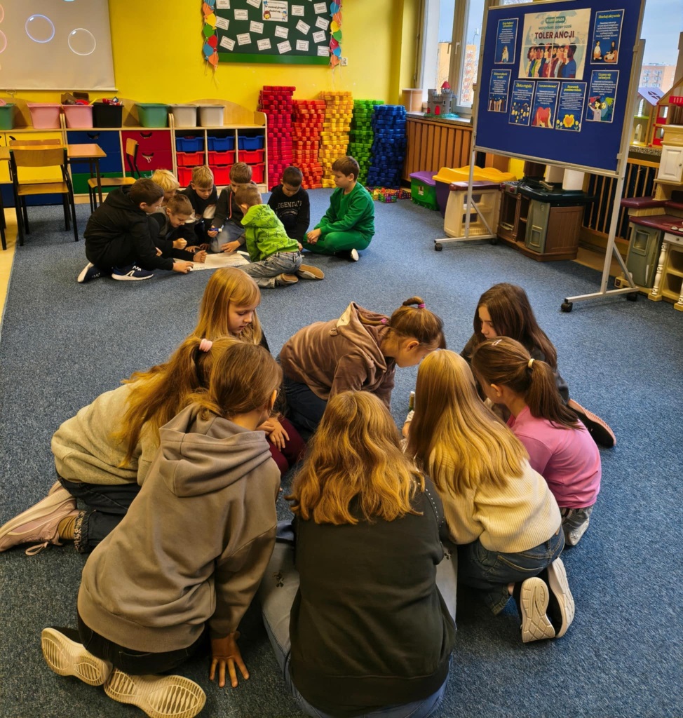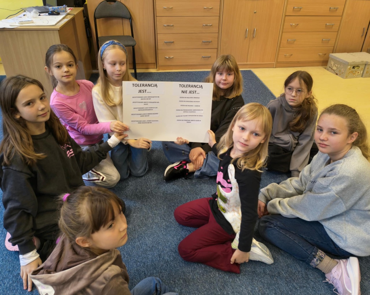 Dlatego w świetlicy klas trzecich zostały przeprowadzone zajęcia, podczas których wyjaśniliśmy sobie pojęcie TOLERANCJA. Obejrzeliśmy również film edukacyjny pt. „Urodziny Maćka, czyli krótki film o tolerancji”, a następnie dyskutowaliśmy o postępowaniu głównego bohatera. Uczniowie zgodnie stwierdzili, że każdy człowiek ma prawo być sobą- myśleć, czuć i wyglądać inaczej niż my. Na zakończenie, pracując w grupach, stworzyliśmy plakaty o tolerancji, które były podsumowaniem naszej wiedzy zdobytej podczas zajęć:).