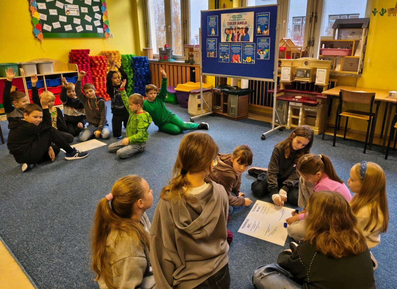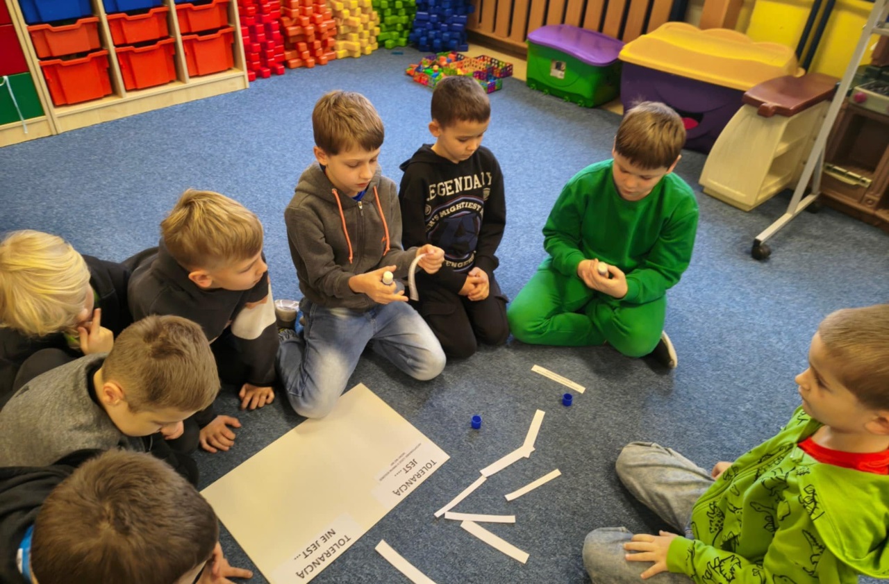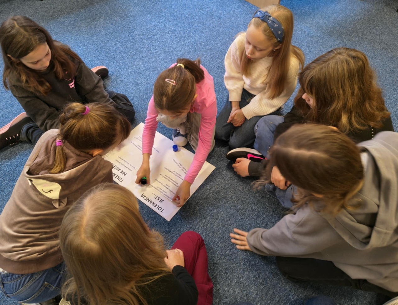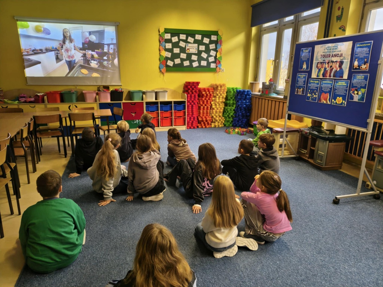 Dlatego w świetlicy klas trzecich zostały przeprowadzone zajęcia, podczas których wyjaśniliśmy sobie pojęcie TOLERANCJA. Obejrzeliśmy również film edukacyjny pt. „Urodziny Maćka, czyli krótki film o tolerancji”, a następnie dyskutowaliśmy o postępowaniu głównego bohatera. Uczniowie zgodnie stwierdzili, że każdy człowiek ma prawo być sobą- myśleć, czuć i wyglądać inaczej niż my. Na zakończenie, pracując w grupach, stworzyliśmy plakaty o tolerancji, które były podsumowaniem naszej wiedzy zdobytej podczas zajęć:).