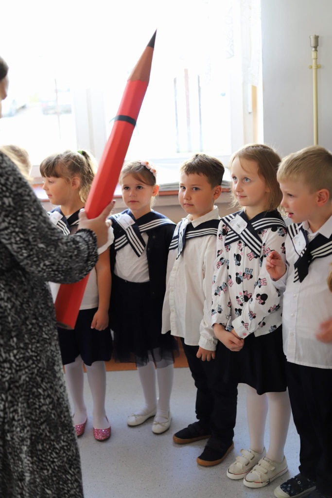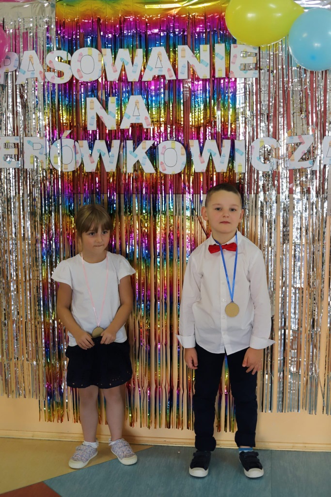 Kulminacyjnym momentem uroczystości było symboliczne pasowanie na Zerówkowicza przez Panią Wicedyrektor Annę Pyć, która ołówkiem wprowadziła dzieci do grona uczniów naszej szkoły. Każdy z nowych Zerówkowiczy otrzymał medal, przypominający, że od tej chwili staje się pełnoprawnym członkiem morskiej załogi.