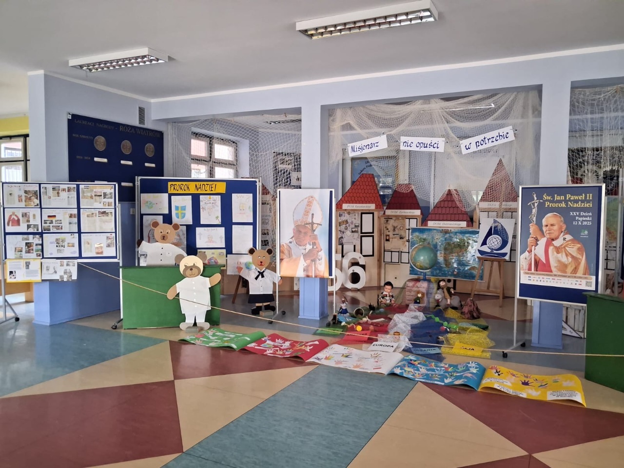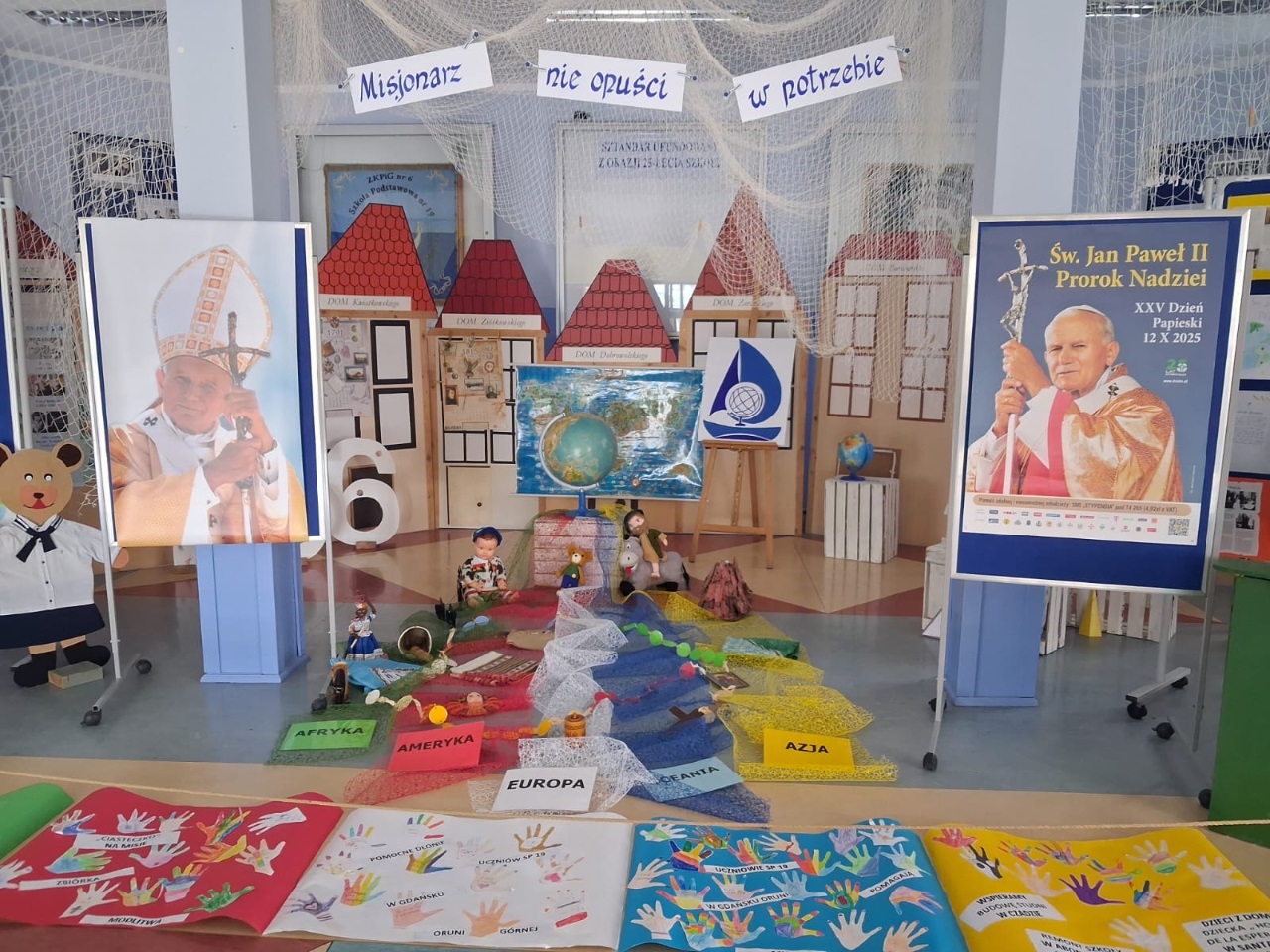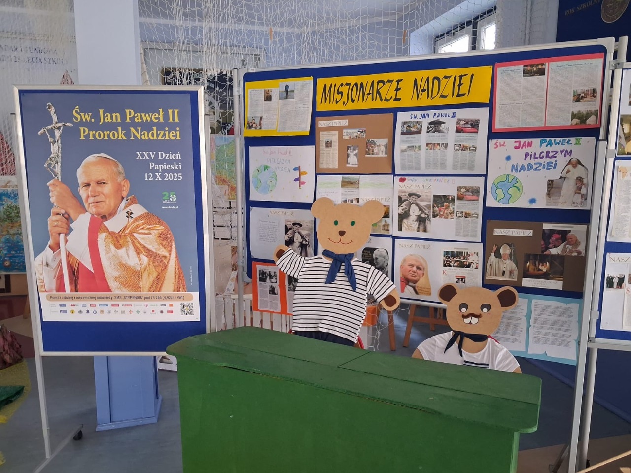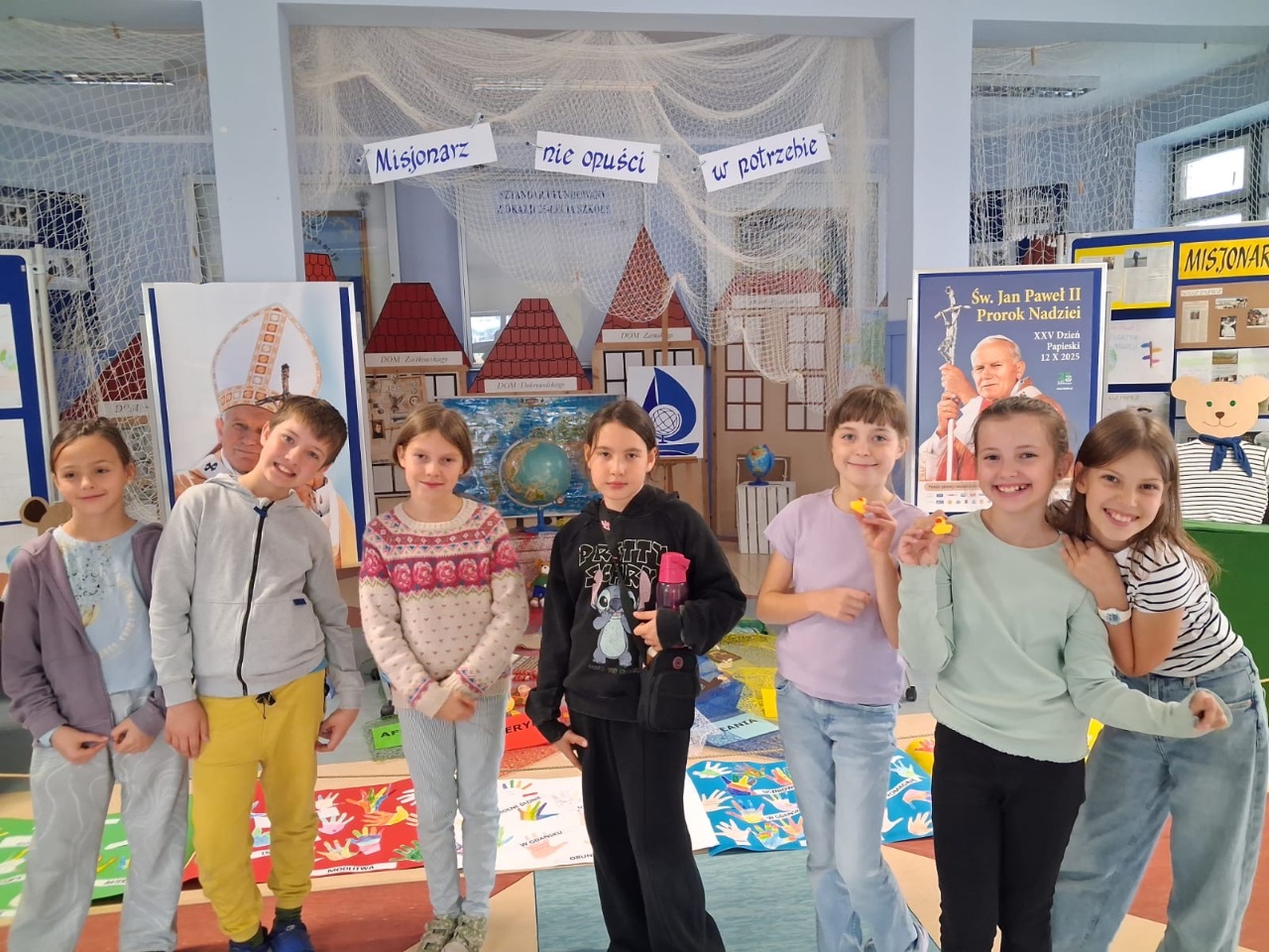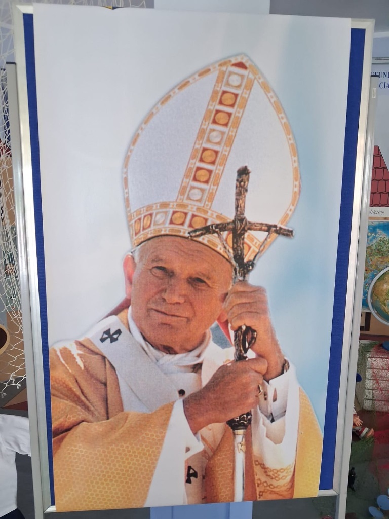 Podczas długich przerw uczniowie mogli sprawdzić swoją wiedzę o św. Janie Pawle II biorąc udział w krótkich quizach i zabawach. Za poprawne odpowiedzi czekała słodka nagroda. W atmosferę wydarzenia pięknie wpisały się plakaty i dekoracje misyjne przygotowane przez uczniów. Szczególną uwagę przyciągały prace z wizerunkiem św. Jana Pawła II, które stały się wyrazem pamięci i szacunku dla Papieża Polaka.