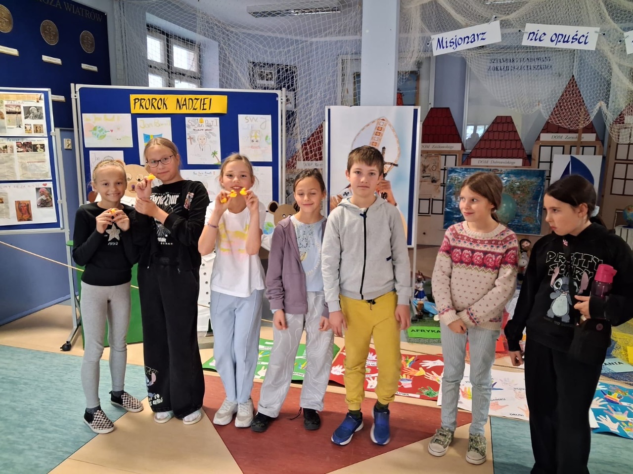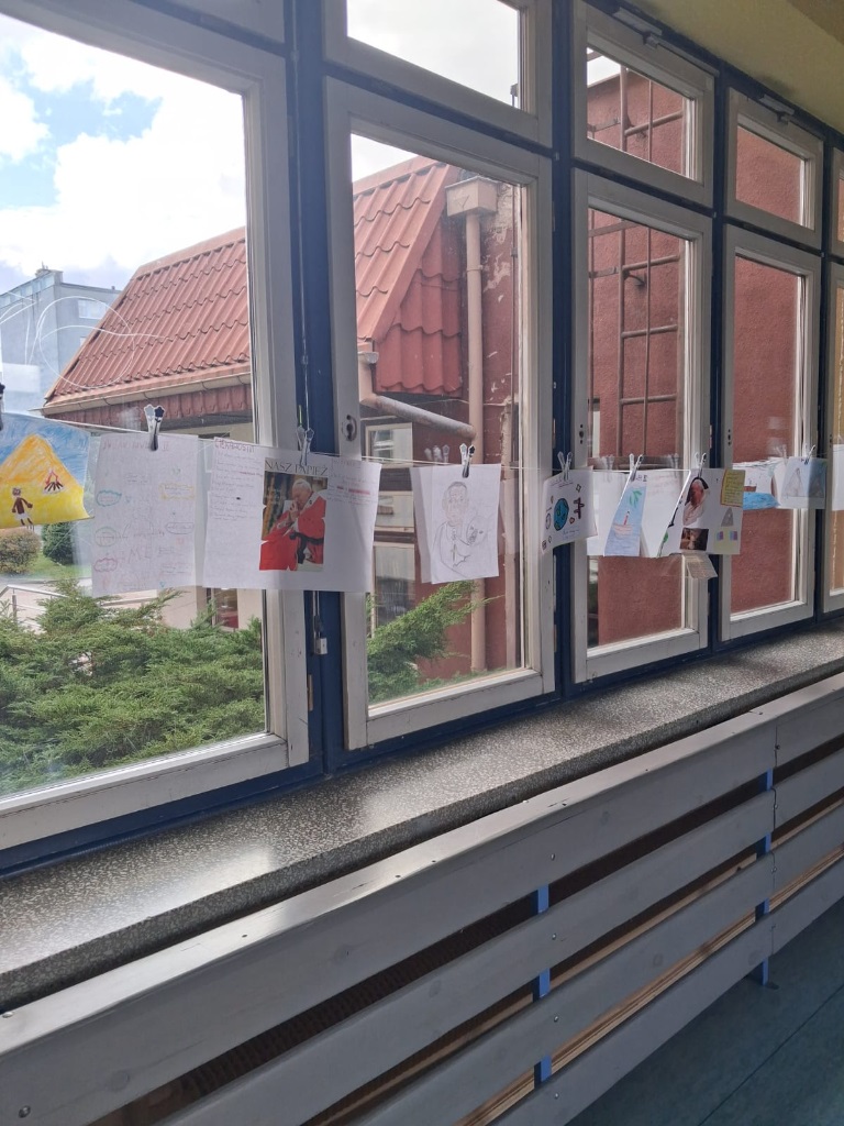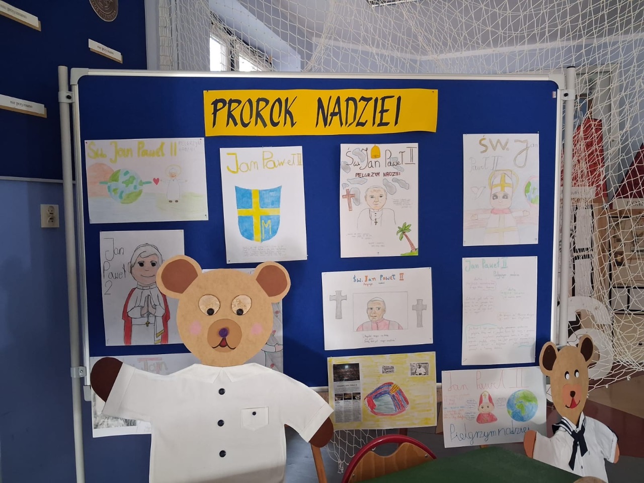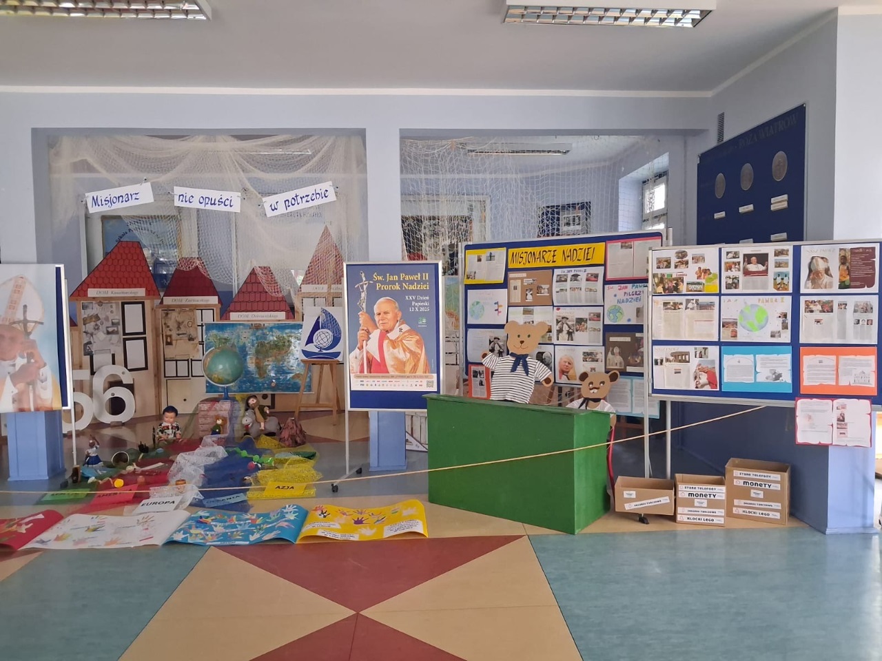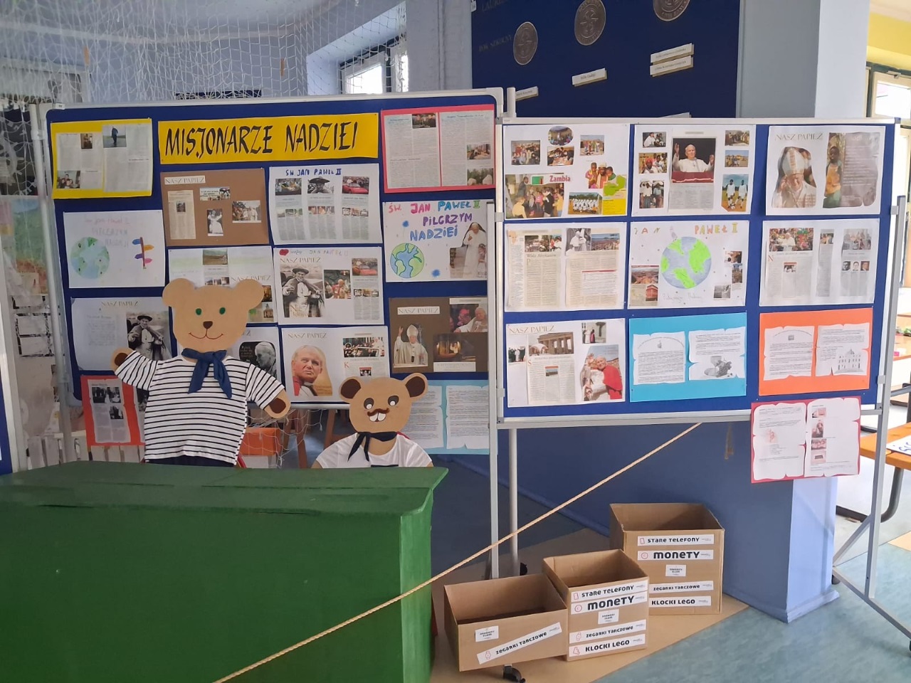 Podczas długich przerw uczniowie mogli sprawdzić swoją wiedzę o św. Janie Pawle II biorąc udział w krótkich quizach i zabawach. Za poprawne odpowiedzi czekała słodka nagroda. W atmosferę wydarzenia pięknie wpisały się plakaty i dekoracje misyjne przygotowane przez uczniów. Szczególną uwagę przyciągały prace z wizerunkiem św. Jana Pawła II, które stały się wyrazem pamięci i szacunku dla Papieża Polaka.