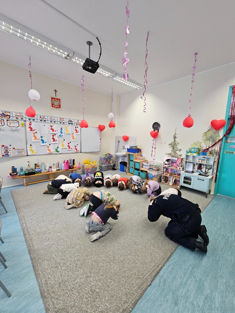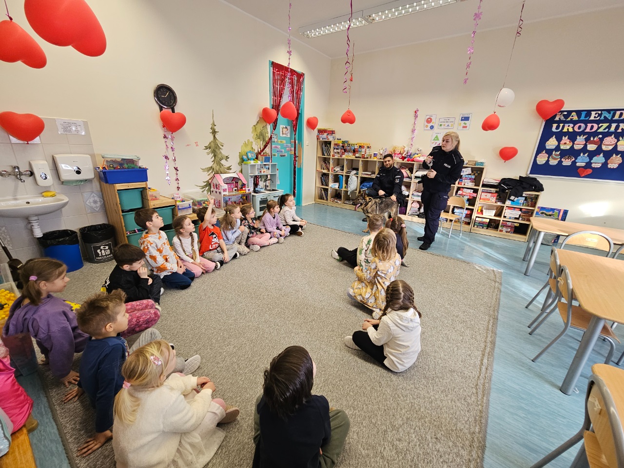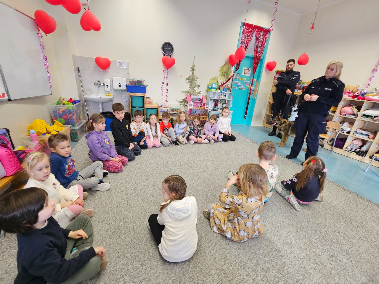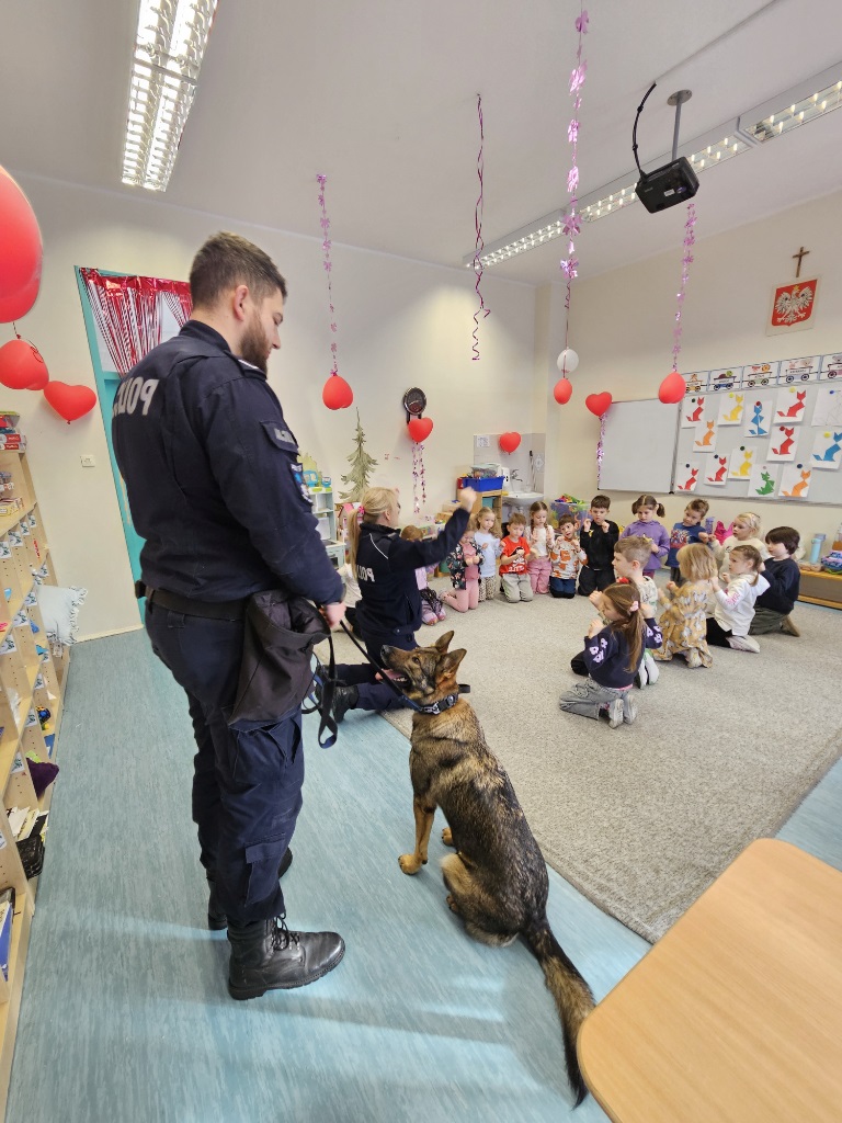 Stróże prawa ostrzegali też dzieci przed osobami nieznajomymi, z którymi nie wolno rozmawiać oraz wpuszczać ich do domu. Jednak na tym spotkaniu największą „gwiazdą” była „Freja” pies patrolowo-tropiący. „Freja” pod kierownictwem swojego opiekuna zaprezentowała swoje umiejętności i wysoki stopień wyszkolenia – tresury. Dzieci z wielkim zainteresowaniem przyglądały się, jak pies reaguje na komendy policjanta.