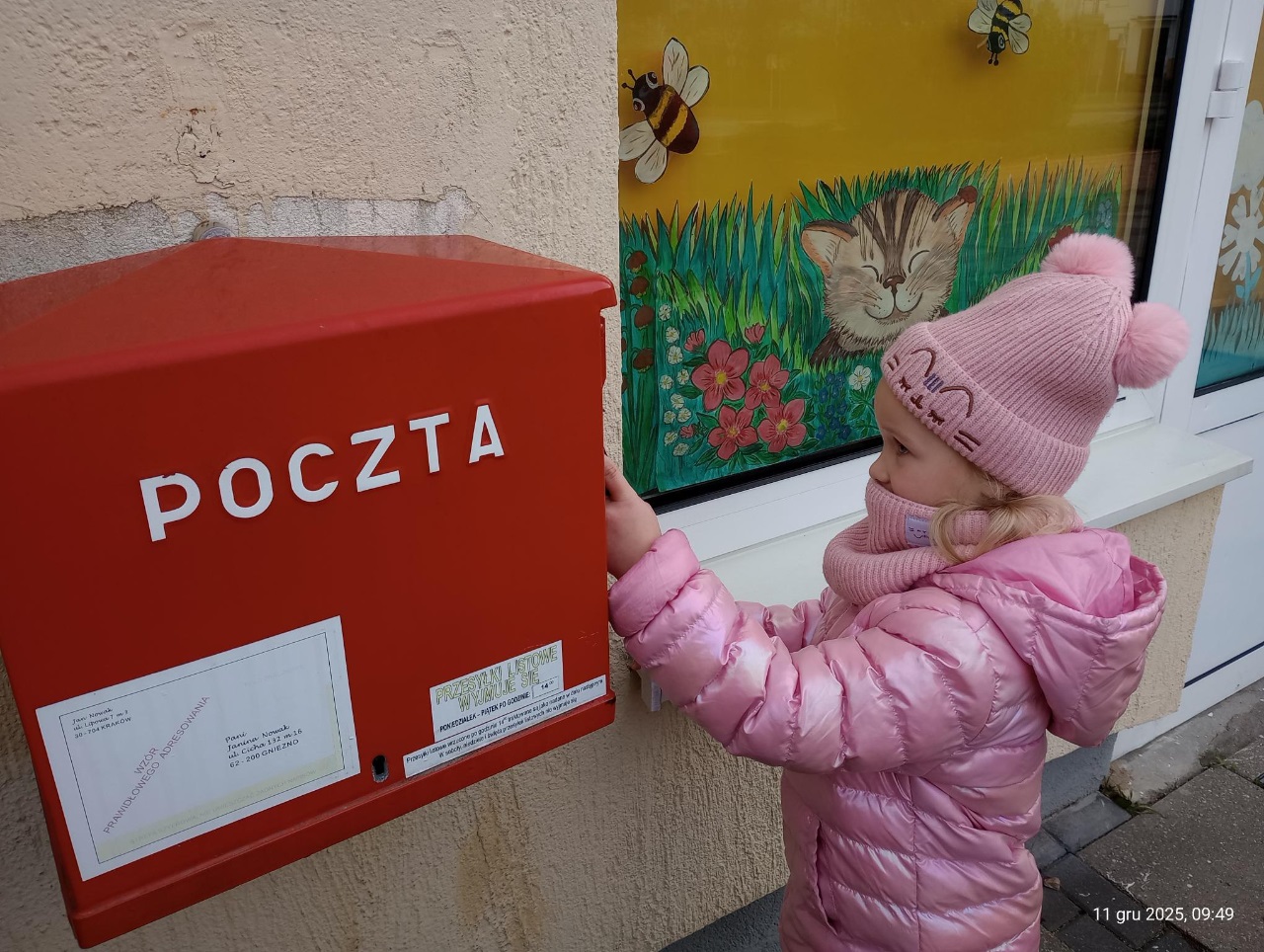Grupa 0A wybrała się wspólnie na spacer w stronę najbliższej poczty. Dzieci z wielkim podekscytowaniem niosły swoje kolorowe kartki, dumne z efektów własnej pracy. Po dojściu do czerwonej skrzynki pocztowej każde dziecko mogło samodzielnie wrzucić swoją kopertę do środka. Dla wielu był to prawdziwie magiczny moment – świadomość, że list wyrusza w drogę do bliskiej osoby, wywoływała mnóstwo radości i uśmiechów.