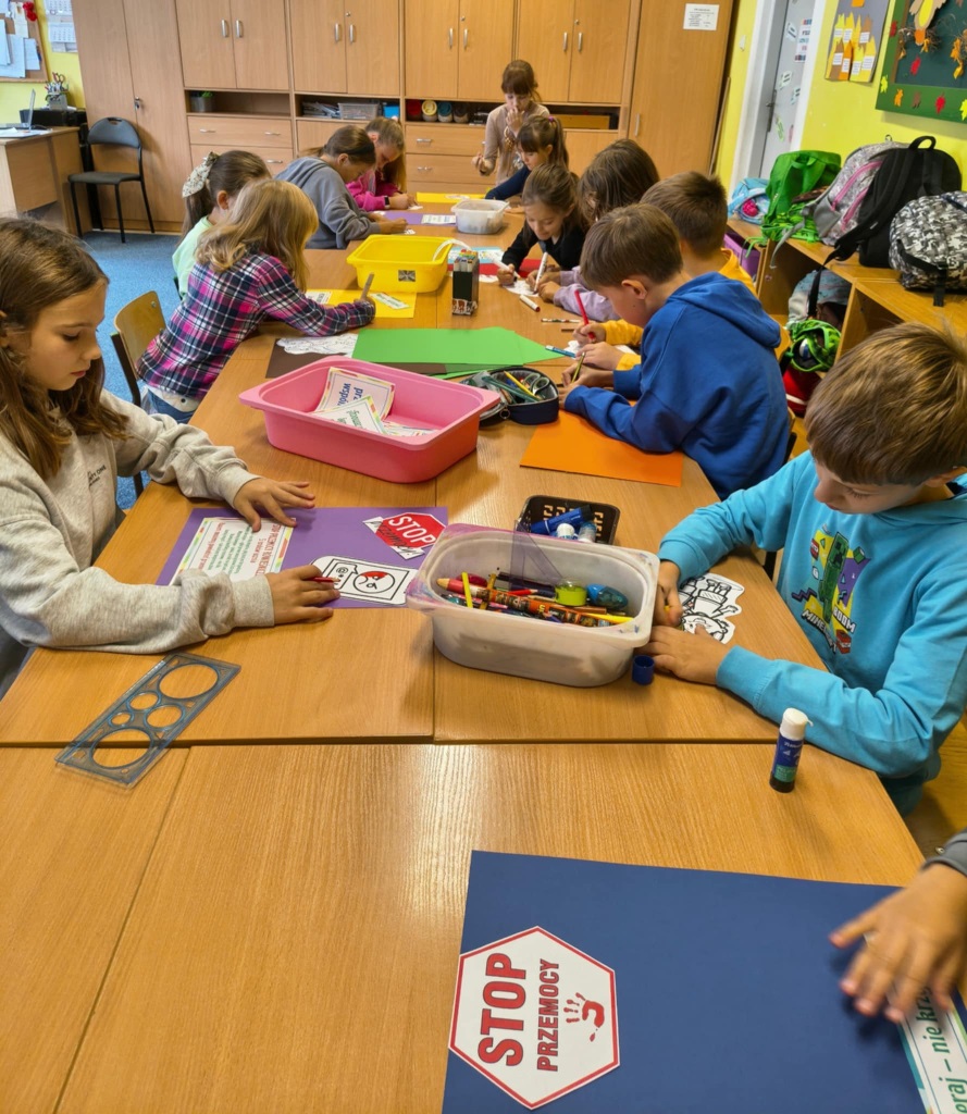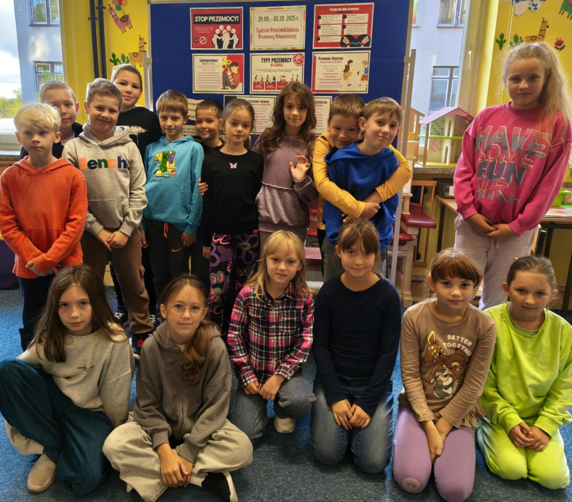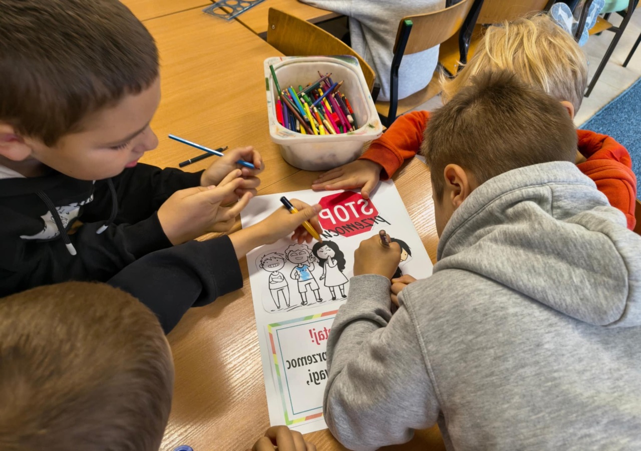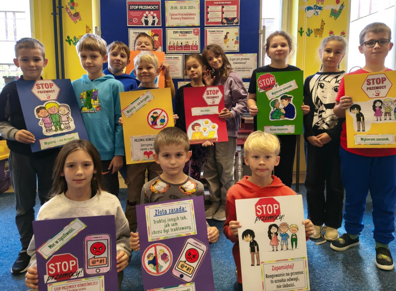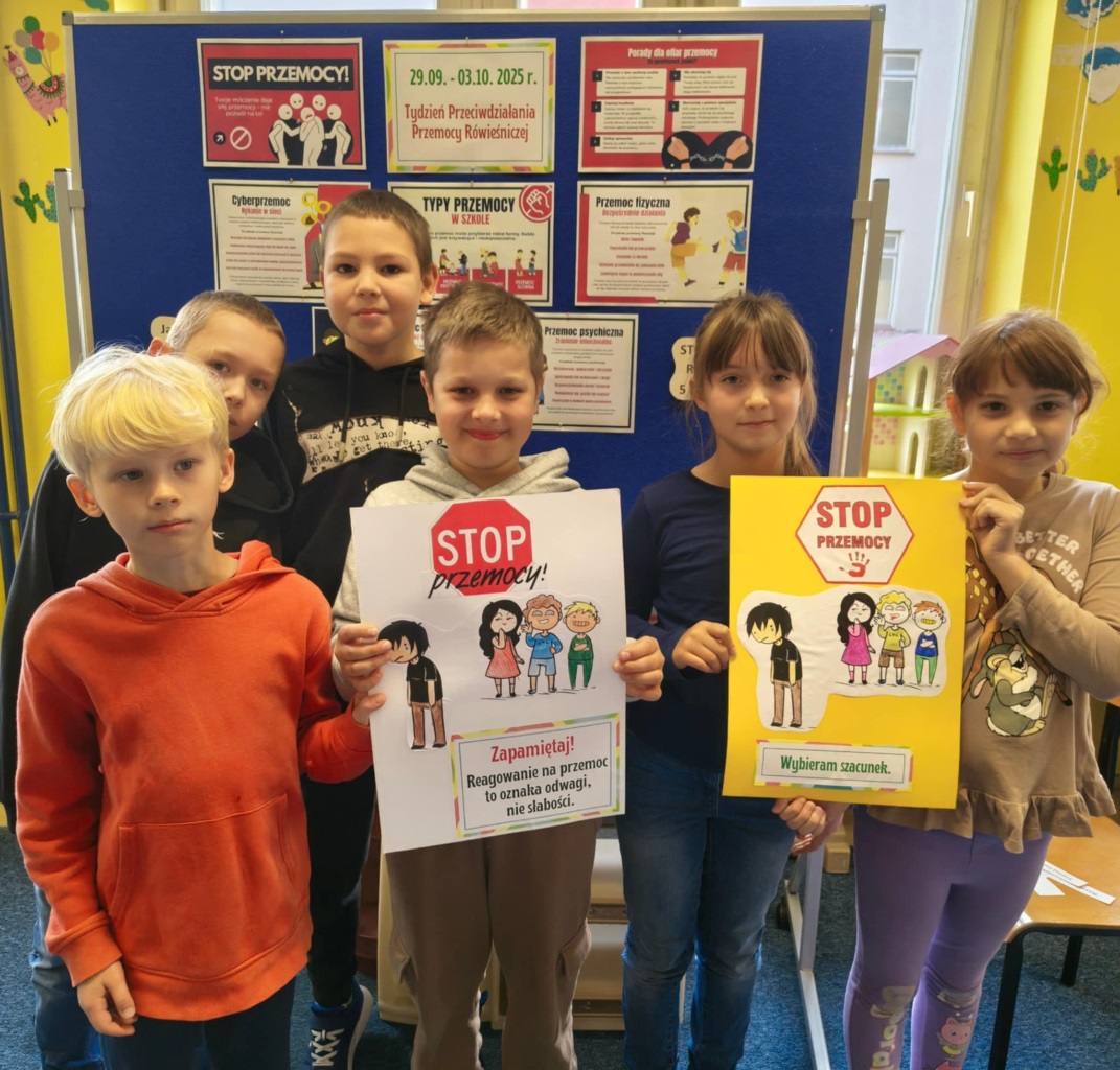 W dniach 29 września – 3 października w świetlicy klas trzecich organizowaliśmy zajęcia pod hasłem „Tydzień o przeciwdziałaniu przemocy rówieśniczej”. Zajęcia miały na celu uświadomienie każdemu dziecku, że nie musi godzić się na ośmieszanie, wykluczanie czy przemoc, a po pomoc można sięgać bez wstydu i strachu. Wspólnie z dziećmi rozmawialiśmy o rodzajach tej przemocy oraz o tym, jak jej przeciwdziałać. Dzieci zgodnie stwierdziły, że w naszej szkole chcą się kierować ZŁOTĄ ZASADĄ: TRAKTUJ INNYCH TAK, JAK SAM CHCESZ BYĆ TRAKTOWANY. Na koniec zajęć uczniowie wykonali plakaty informacyjne dotyczące przeciwdziałania przemocy rówieśniczej, które powiesiliśmy w naszej świetlicy. Wspólnie mówimy – NIE DLA PRZYMOCY!