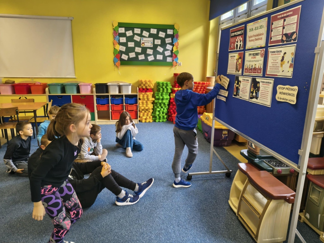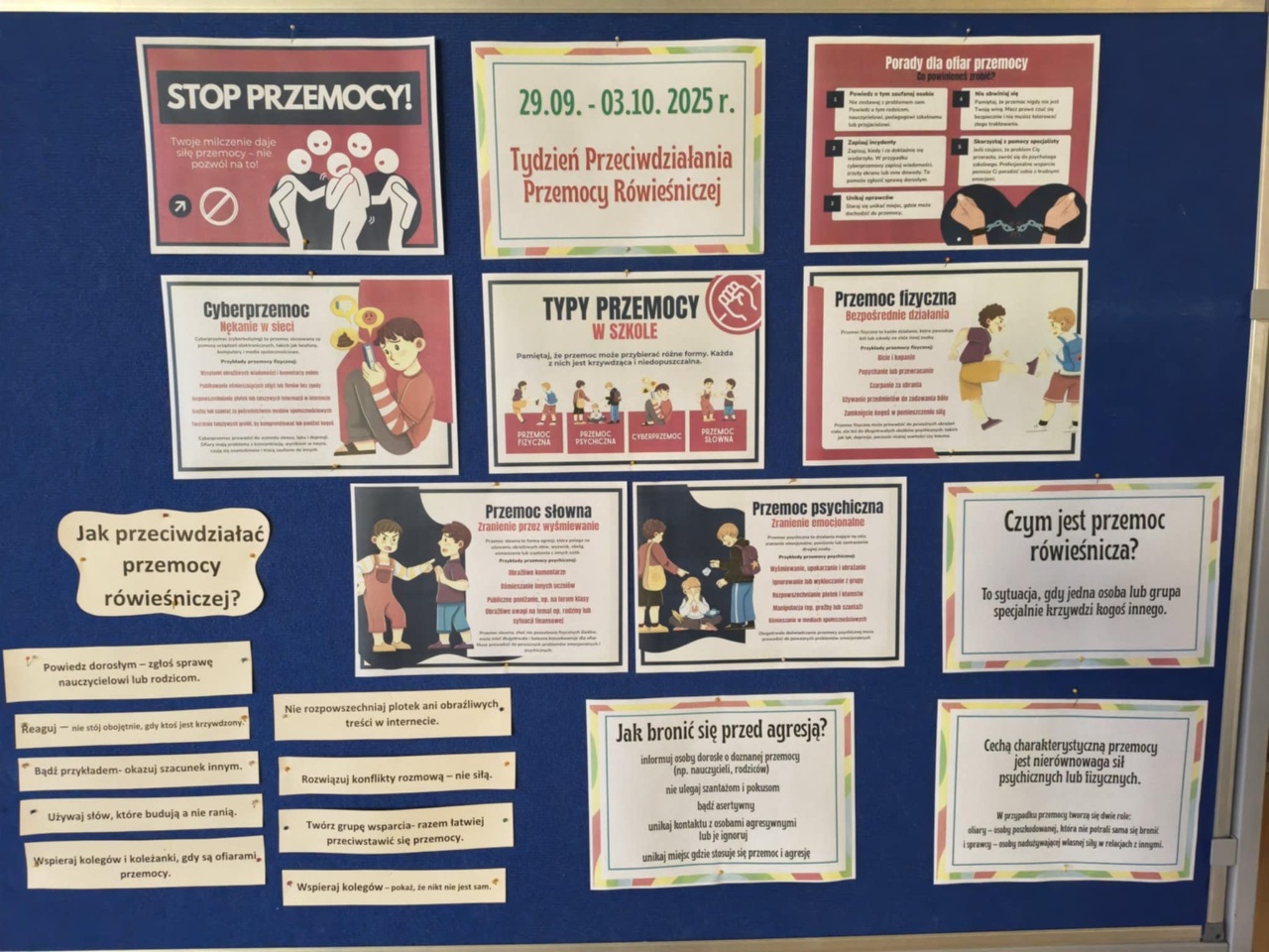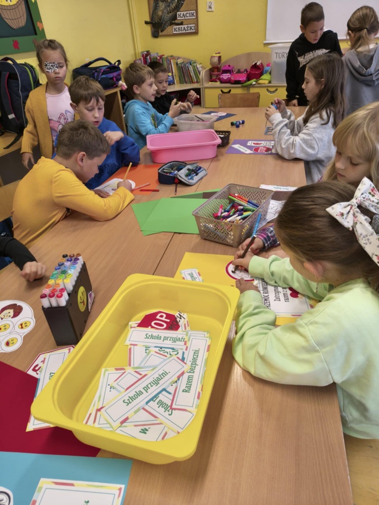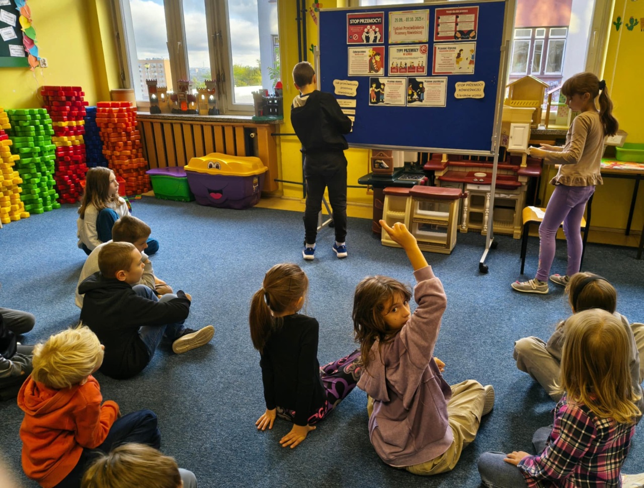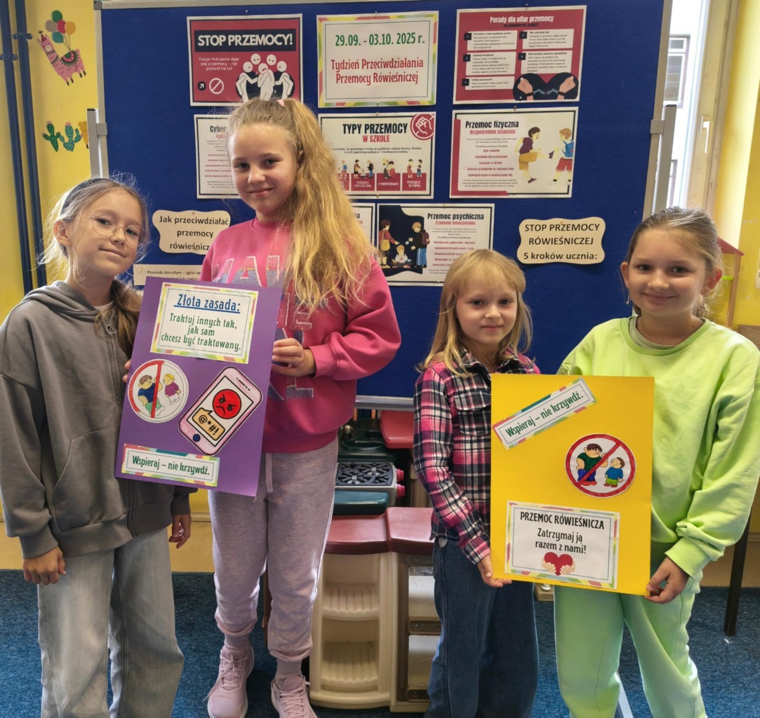 W dniach 29 września – 3 października w świetlicy klas trzecich organizowaliśmy zajęcia pod hasłem „Tydzień o przeciwdziałaniu przemocy rówieśniczej”. Zajęcia miały na celu uświadomienie każdemu dziecku, że nie musi godzić się na ośmieszanie, wykluczanie czy przemoc, a po pomoc można sięgać bez wstydu i strachu. Wspólnie z dziećmi rozmawialiśmy o rodzajach tej przemocy oraz o tym, jak jej przeciwdziałać. Dzieci zgodnie stwierdziły, że w naszej szkole chcą się kierować ZŁOTĄ ZASADĄ: TRAKTUJ INNYCH TAK, JAK SAM CHCESZ BYĆ TRAKTOWANY. Na koniec zajęć uczniowie wykonali plakaty informacyjne dotyczące przeciwdziałania przemocy rówieśniczej, które powiesiliśmy w naszej świetlicy. Wspólnie mówimy – NIE DLA PRZYMOCY!