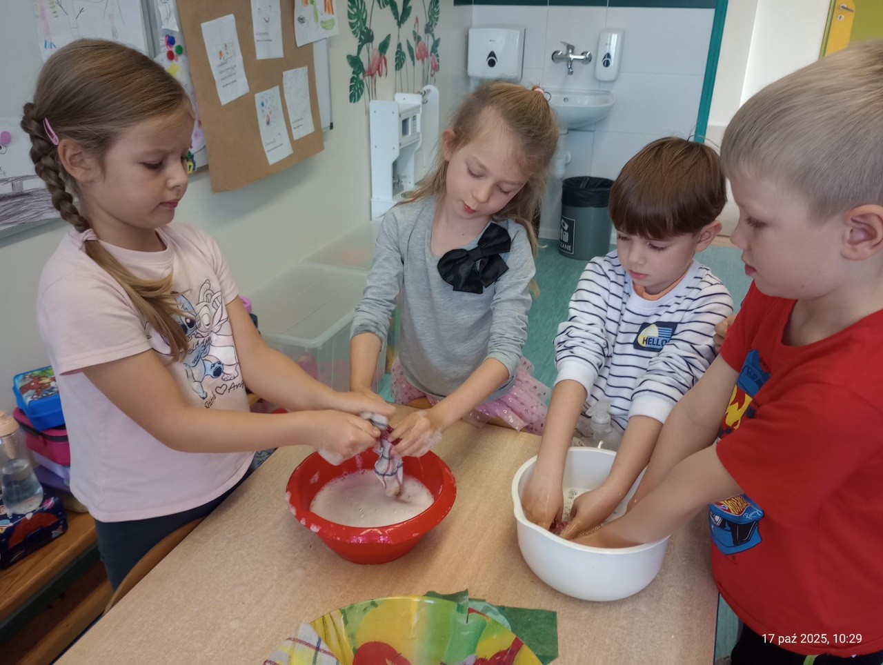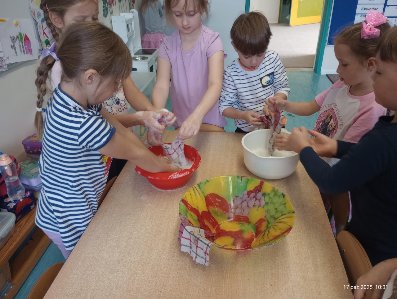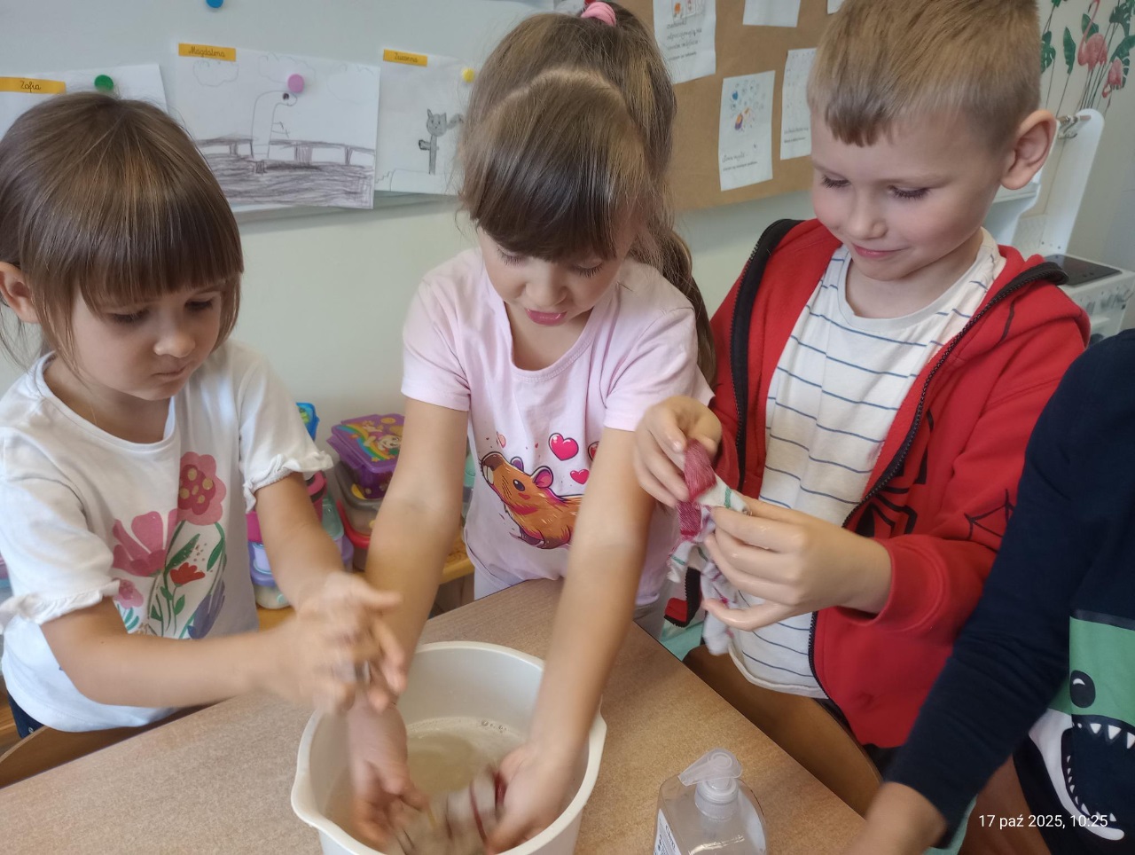 W ostatnim czasie grupa 0A rozmawiała na temat wynalazków - w ramach zajęć dzieci przeprowadziły doświadczenie z zabrudzonymi materiałami.