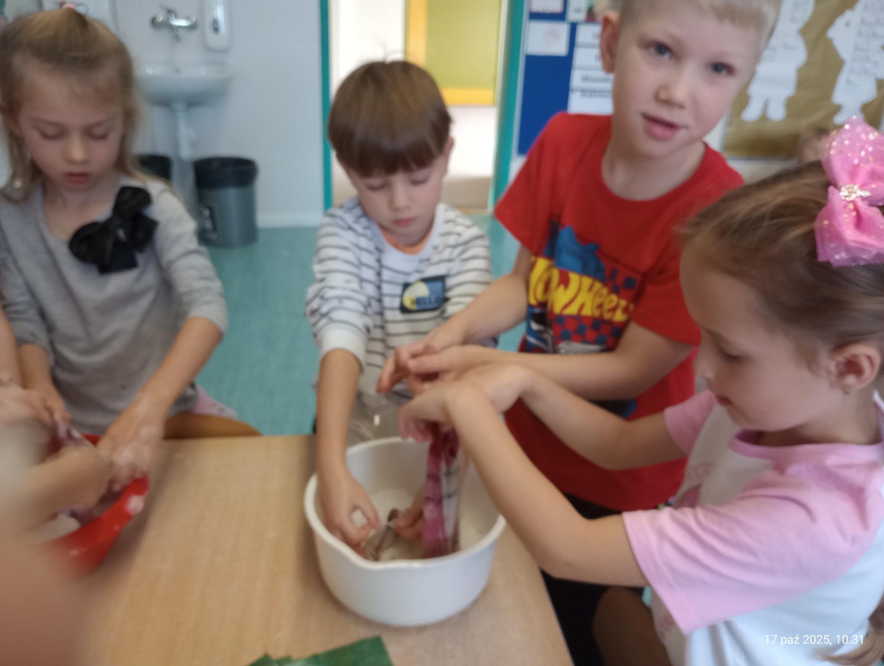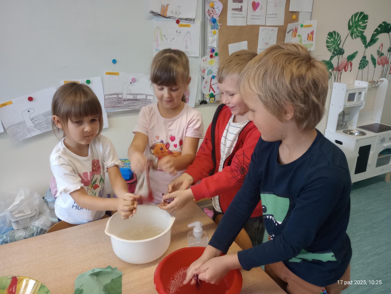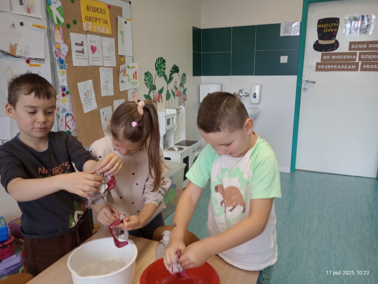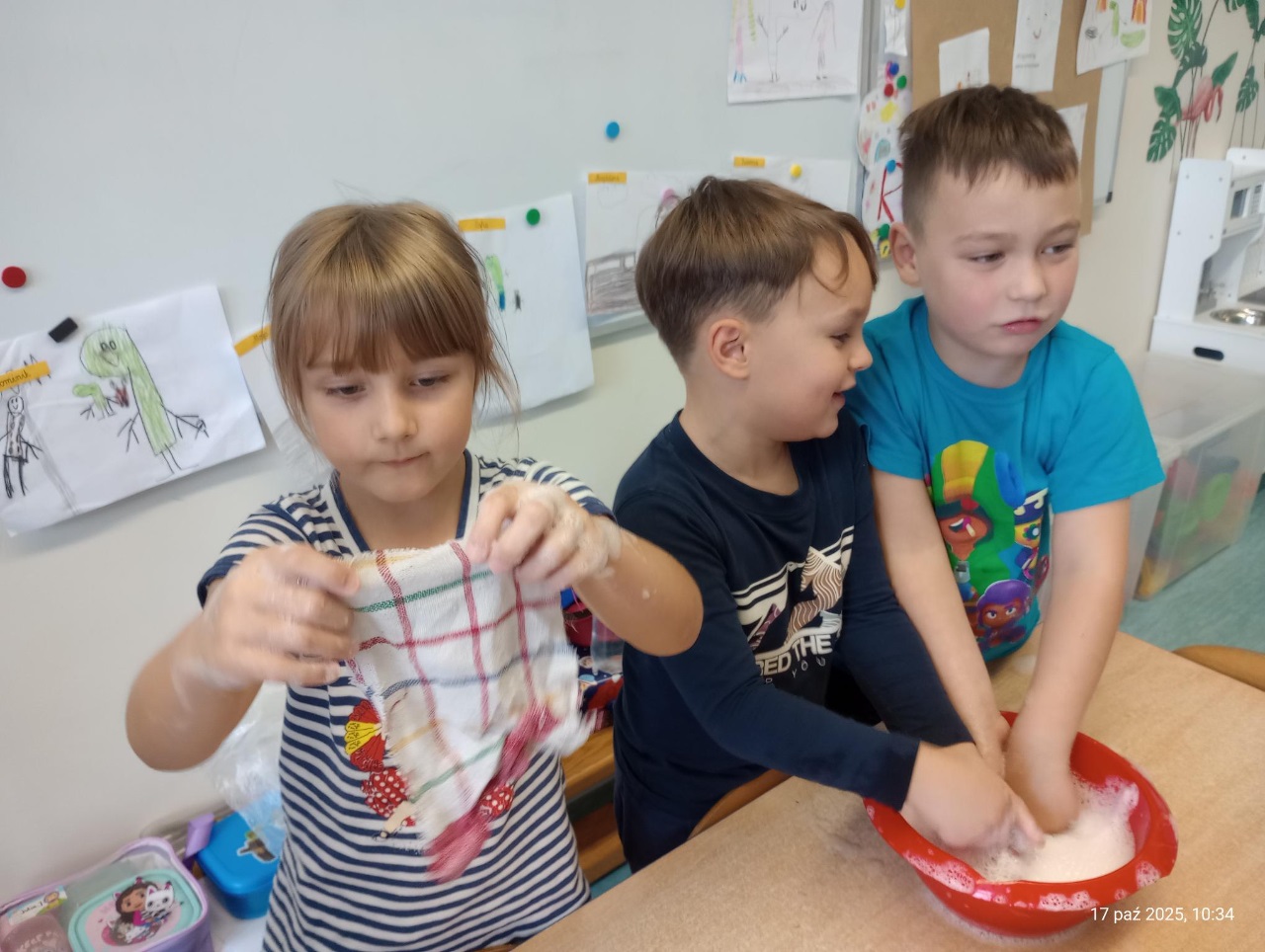 W ostatnim czasie grupa 0A rozmawiała na temat wynalazków - w ramach zajęć dzieci przeprowadziły doświadczenie z zabrudzonymi materiałami.