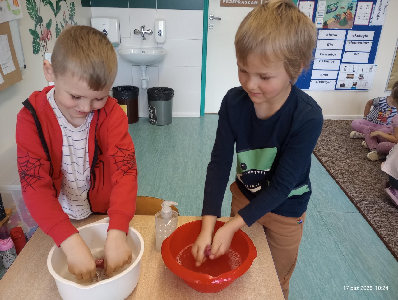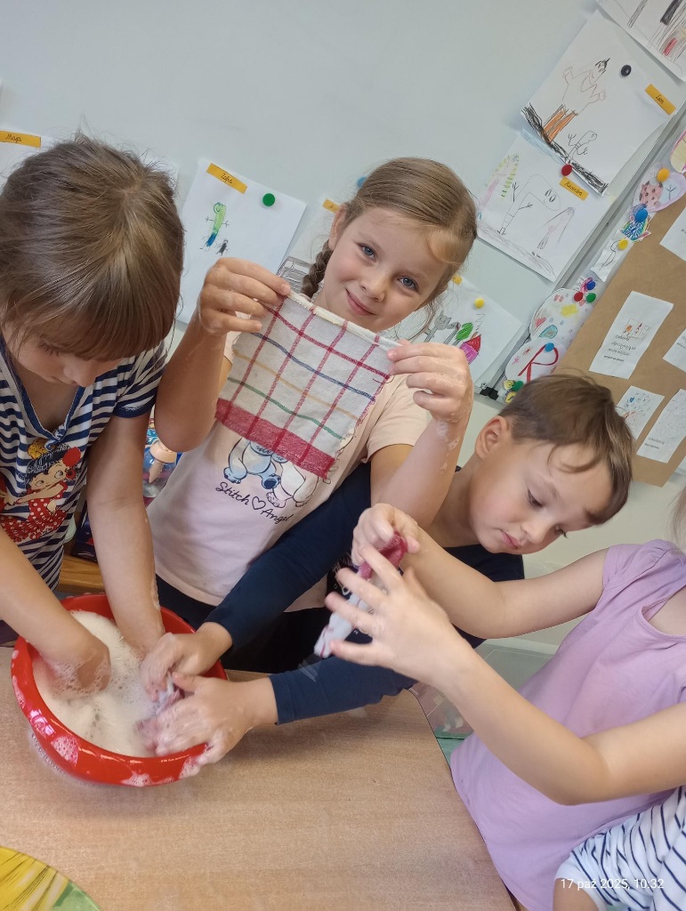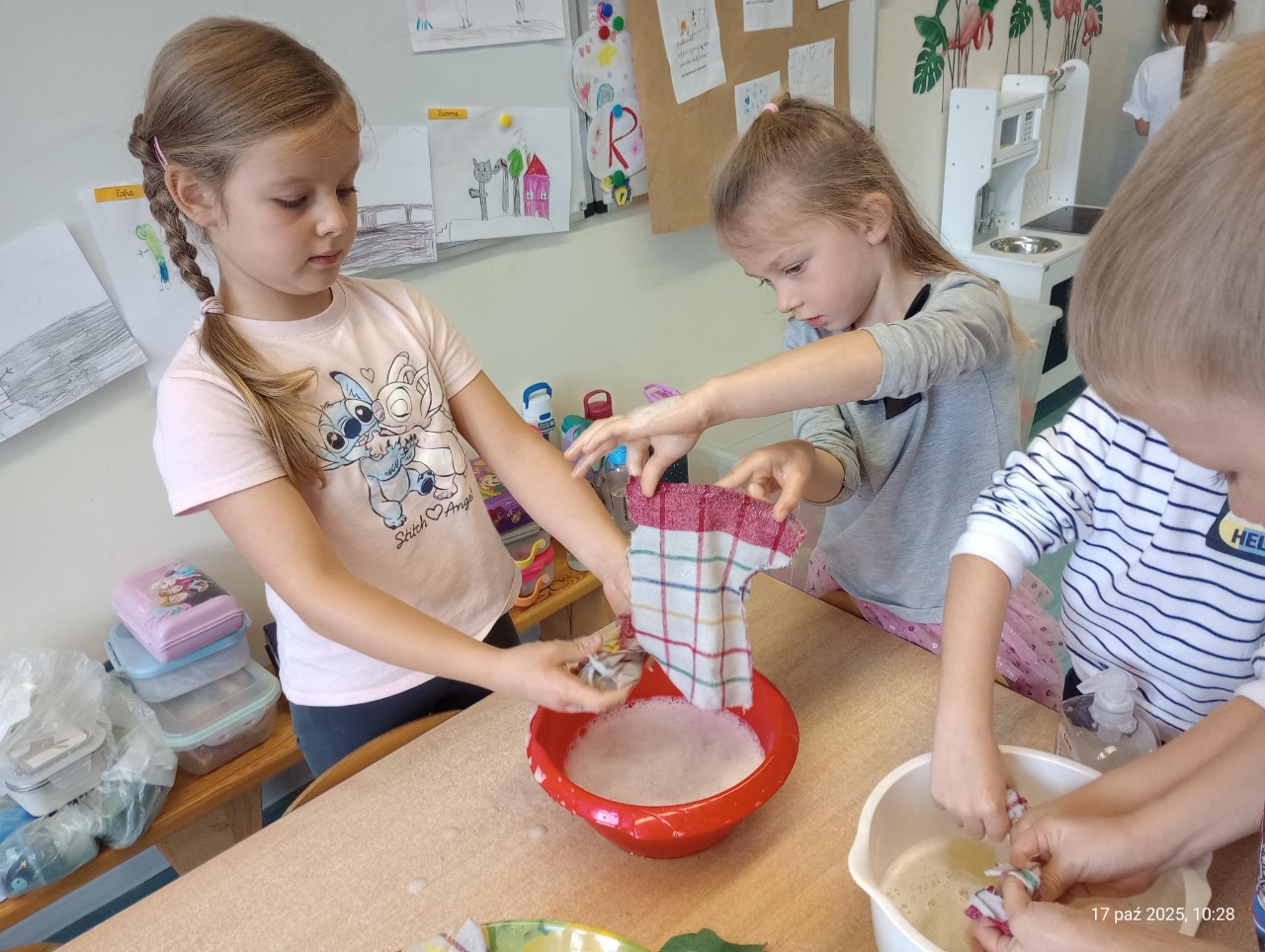 Wspólnie ustaliliśmy, co jest potrzebne do usuwania zabrudzeń oraz szukaliśmy odpowiedzi na pytanie, czy temperatura wody ma znaczenie podczas usuwania zabrudzeń. Dzieci miały również okazję wykonać pranie ręczne i przyznać, że pralka to wynalazek, który zdecydowanie ułatwia życie.